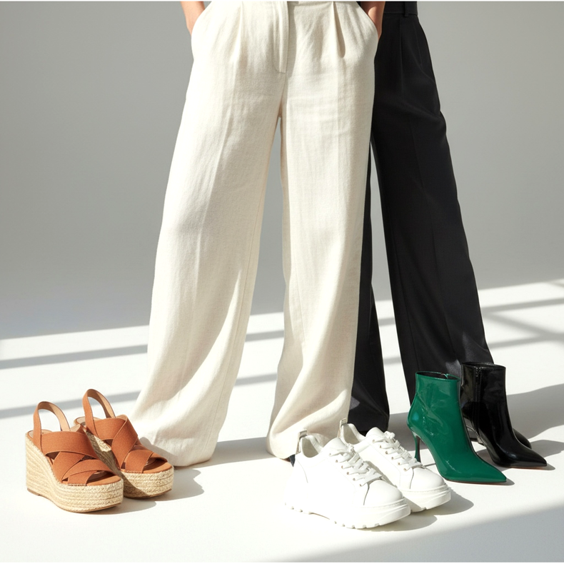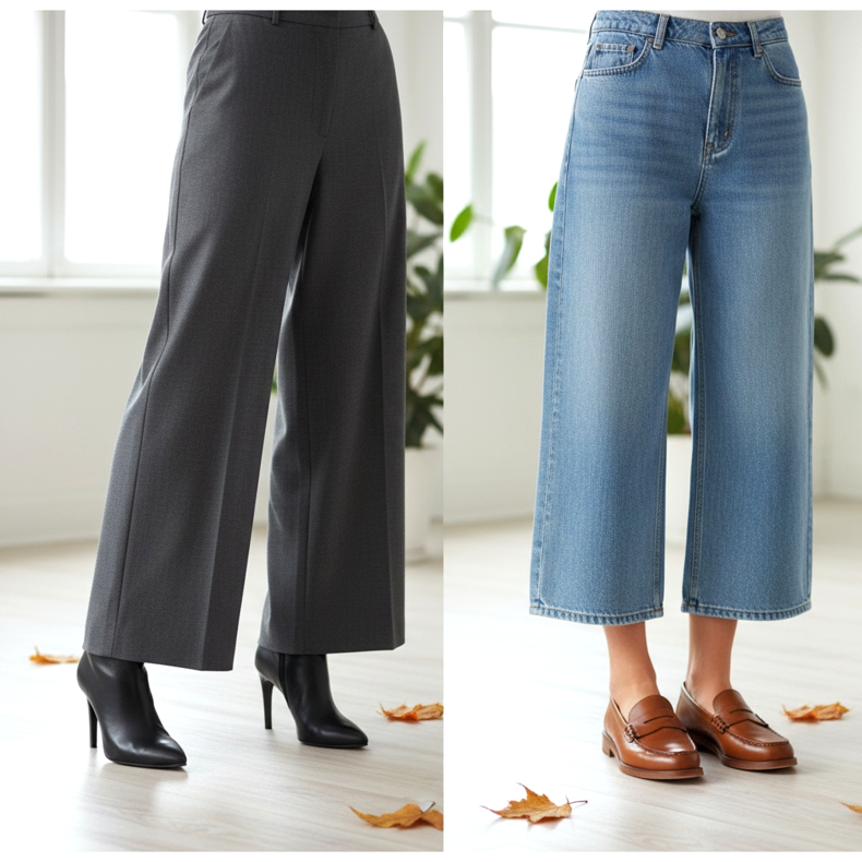 De nombreuses femmes ne réalisent pas à quel point la longueur de la jambe joue un rôle important par rapport à la hauteur du talon lorsqu'elles portent des jambes larges. La règle la plus simple : plus la jambe est longue, plus il faut monter le talon haut pour qu'il ne traîne pas au sol et ne raccourcisse pas visuellement la silhouette.