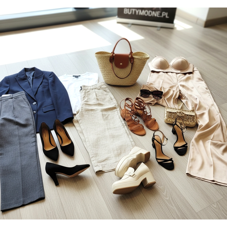 Pour une escapade en week-end : des jambes larges en lin clair ou beige jusqu'aux chevilles, un t-shirt blanc et des sandales spartiates ou des mocassins à semelle plus épaisse. L'ensemble est complété par un sac à main en paille et des lunettes noires – une ambiance estivale totale sans exagération. Pour une soirée : pantalon large en satin champagne ou doré, corset ajusté et sandales à talons hauts avec bride cheville. Une élégance pure, prête pour une occasion spéciale. Parcourez les offres sur KeeShoes et composez la tenue parfaite avec des jambes larges !