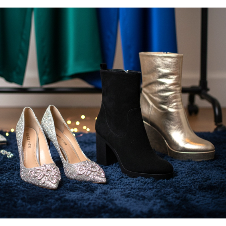 La solution parfaite sera des talons hauts aux couleurs sobres que vous pourrez assortir au reste de votre tenue. Si vous allez à une soirée, vous pouvez choisir des modèles avec des décorations accrocheuses, par exemple avec des cristaux ou des accents métalliques.