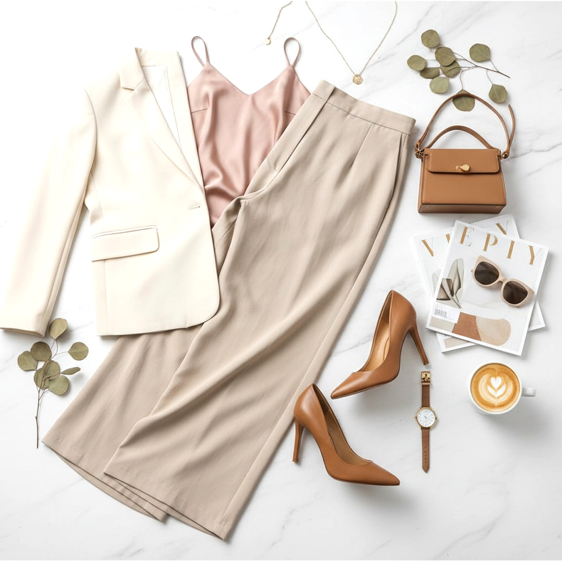 La solution parfaite sera des escarpins à talon bloc ou à talon aiguille. Choisissez des modèles aux couleurs sobres – noir, beige ou marron. N'oubliez pas que les pantalons palazzo ont des jambes larges, donc les talons hauts aideront à maintenir les bonnes proportions de la silhouette.