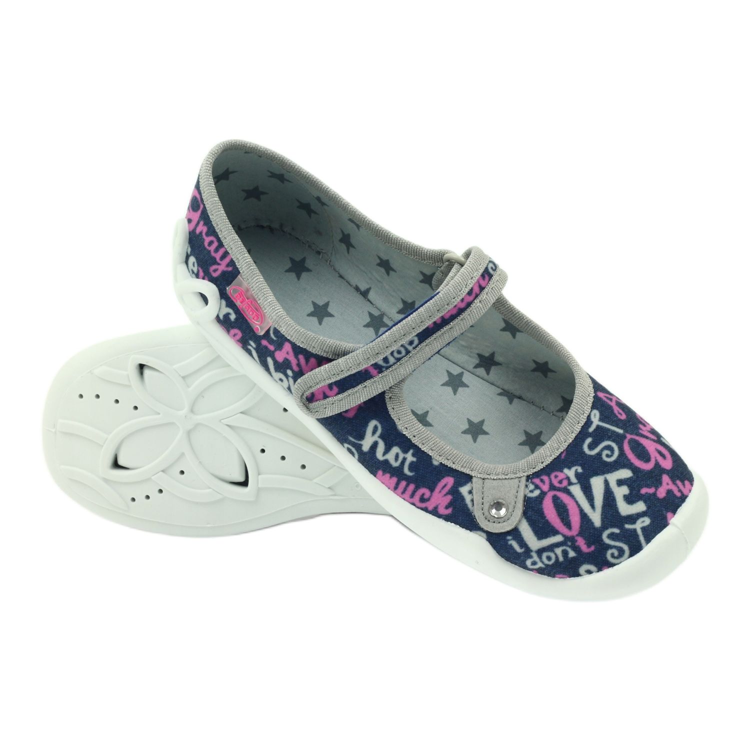 Chaussons ballerines Befado. 114y311 sont des chaussures parfaites pour les petites filles, qui allient design à la mode et grand confort d'utilisation. Confectionnés dans un tissu denim résistant d'une belle couleur bleu marine, ils sont décorés d'inscriptions colorées qui leur confèrent un caractère unique. Ces adorables pantoufles sont parfaites pour l'école, la maison ou dans la cour, offrant aux pieds de votre enfant le soutien dont il a besoin.
