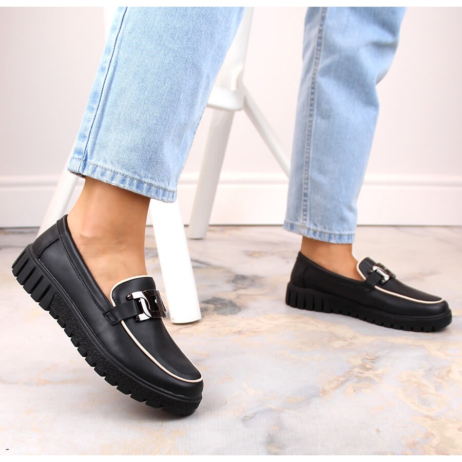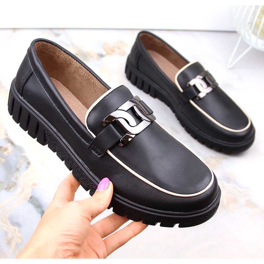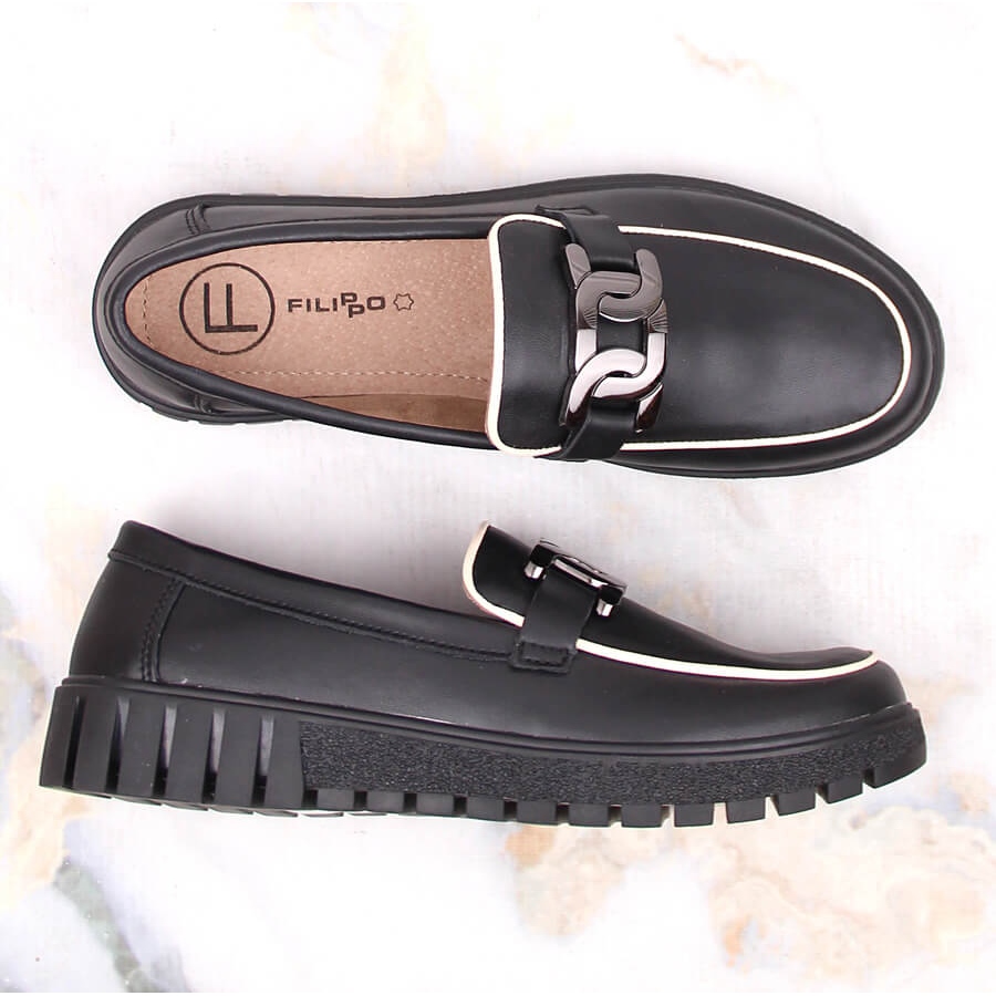 Des chaussures élégantes et confortables de Filippo DP4728 sont une proposition pour les femmes qui apprécient la coupe classique avec un accent à la mode. Fabriqués en cuir naturel de haute qualité, ils combinent le noir universel avec une décoration subtile sous la forme d'une chaîne métallique sur la plate-forme - idéale pour les styles quotidiens et plus formels.