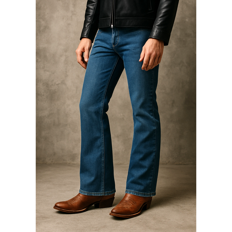 Les jeans bootcut et flare se caractérisent par une extension du genou vers le bas, créée spécialement pour les chaussures montantes. Les meilleurs ajustements sont : les bottes de cowboy (bottes western), les bottes Chelsea, les bottes jodhpur, les bottes de travail, les bottes hautes à lacets. Les jambes doivent recouvrir la tige et tomber légèrement sur la chaussure. Évitez les baskets basses : elles auront l'air perdues sous un pantalon large. Un jean bootcut foncé avec des bottines Chelsea noires et une veste en cuir donnent un look rock. Des fusées éclairantes avec des bottes de cowboy marron confèrent au style une ambiance bohème-country. Cette coupe de jean est revenue en vogue dans la mode masculine moderne.