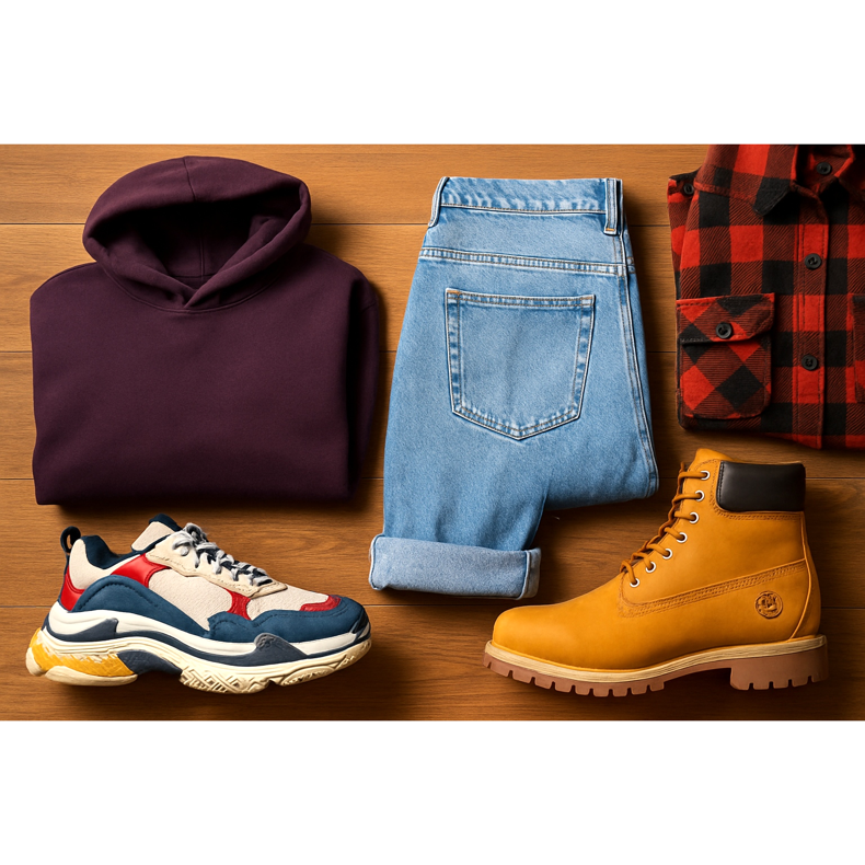 Les jeans amples, décontractés ou charpentiers nécessitent des chaussures plus volumineuses qui équilibreront une silhouette large. Parfaits seront : des baskets chunky (Balenciaga Triple S, Nike Air Max), des bottes hautes, des Dr. Martens, des bottes Timberland, des bottes de travail, des bottes de combat, des chaussures de skateboard épaisses. Les chaussures trop délicates se perdront sous les jambes larges. En retroussant les jambes, le style semble plus intentionnel. Look streetwear : jean oversize + baskets chunky + sweat à capuche oversize. Style workwear : jean charpentier + pantalon Timberland + chemise en flanelle.
