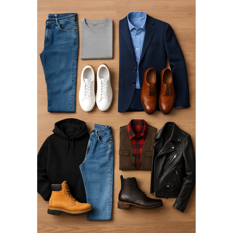Style décontracté : jean + baskets ou mocassins + t-shirt ou polo est un classique du week-end au quotidien. Smart casual : jean foncé + richelieu ou derby marron + chemise + veste - style pour le travail avec un code vestimentaire ample ou pour des événements moins formels. Streetwear : jean baggy + bottes hautes ou baskets chunky + sweat oversize – style urbain et jeune. Vêtements de travail : jean droit + bottes de travail + chemise en flanelle + gilet - inspirés de l'esthétique ouvrière. Rock/biker : jean noir + bottines Chelsea ou santiags + veste en cuir – un classique du rock. Chaque style nécessite une correspondance appropriée entre la coupe du jean et le type de chaussures.
