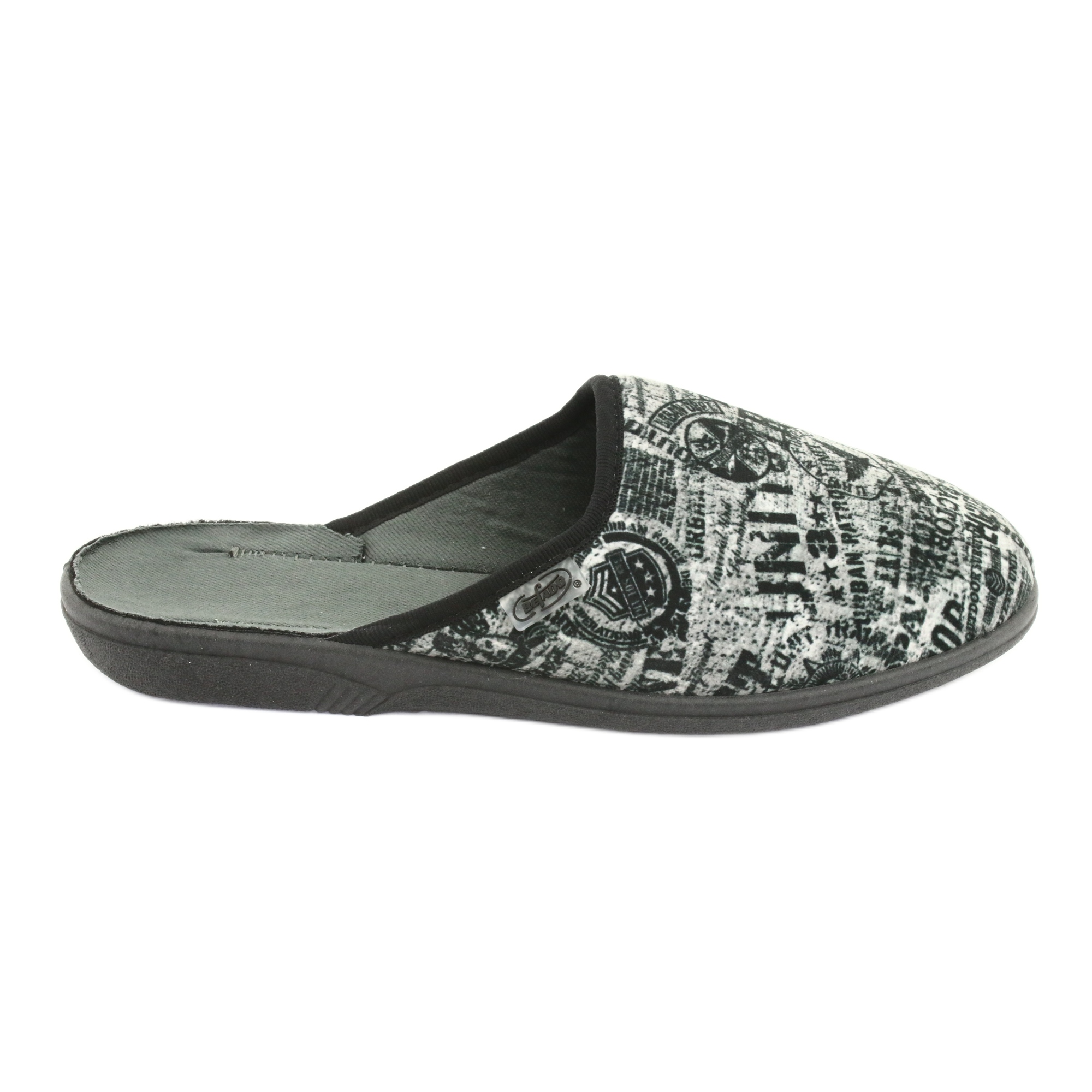 Des pantoufles à domicile pratiques et confortables de Befado - Modèle 201Q091 en couleur grise avec imprimés. Les tongs glissés avec un orteil construit pour protéger vos doigts, et la semelle dure protège les pieds contre le froid, même sur des carreaux froids. L'insert en tissu doux augmente le confort de l'utilisation et offre une respirabilité.