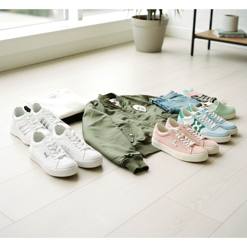 Si vous souhaitez ajouter un peu de couleur à votre tenue, vous pouvez choisir des baskets dans des tons pastel – rose, bleu ou vert. Ces chaussures bomber sont parfaites pour le printemps et l’été, créant un look frais et jeune.