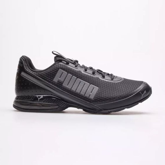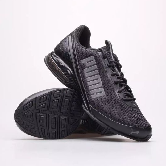 Le produit est des baskets pour hommes de Puma, modèle Cell Divide Mesh. Ce sont des chaussures noires avec le logo de la marque comme motif dominant. Elles sont fabriquées en matière synthétique, avec du tissu comme matériau de la semelle intérieure. Elles ont des lacets en guise de fermeture et une semelle noire.