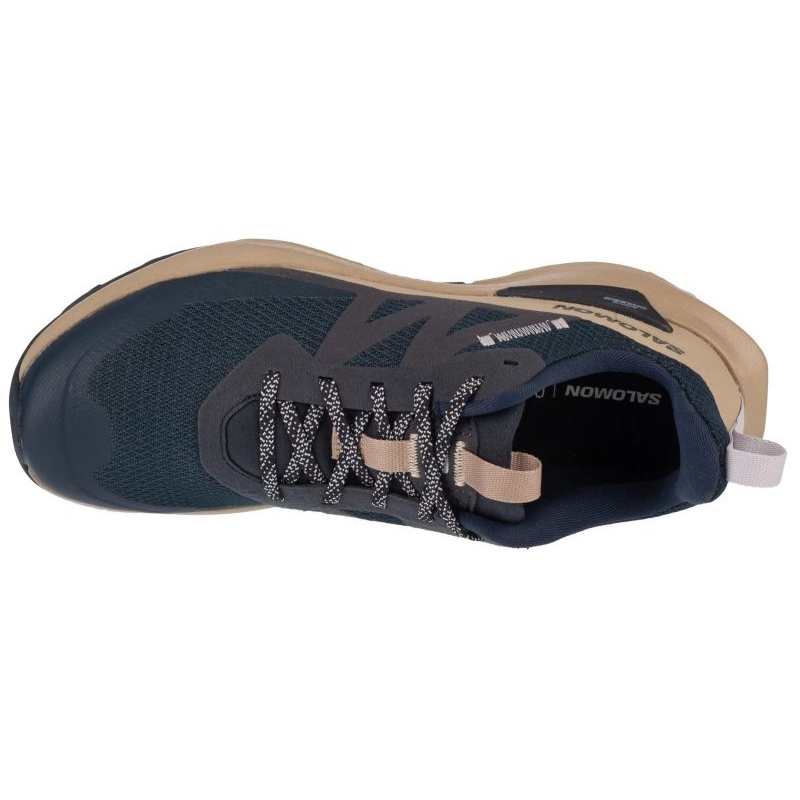 Ce modèle se distingue par ses couleurs universelles, combinant des nuances de bleu marine et de beige avec un logo visible du fabricant, ce qui donne aux chaussures un aspect élégant et moderne. Fixées par des lacets, elles permettent un ajustement individuel à la forme du pied, essentiel pour conserver une stabilité et un confort optimal lors de l'activité physique.