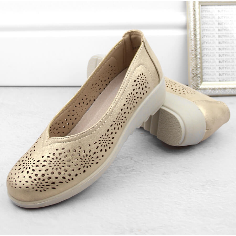 Les chaussures compensées ajourées pour femmes d'une élégante couleur dorée, modèle Potocki 90300, sont un excellent choix pour les femmes qui souhaitent allier confort et style à la mode. Fabriqués en éco-cuir de haute qualité, ces escarpins allient design moderne et fonctionnalité.