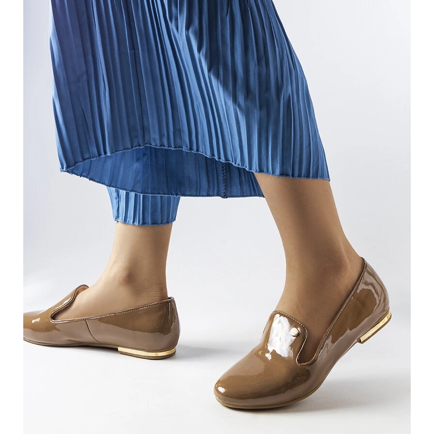 Les chaussures brunes verni sont glissantes et les chaussures de femmes basses combinant une coupe classique avec un brillant moderne. Fabriqué en cuir verni écologique, avec un nez arrondis et des accents dorés subtils, ils travailleront à la fois au travail et lors de réunions avec des amis. Grâce à la semelle plate, ils sont légers et confortables pendant de longues journées.