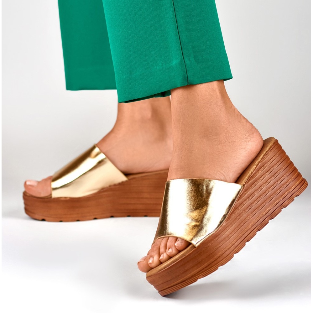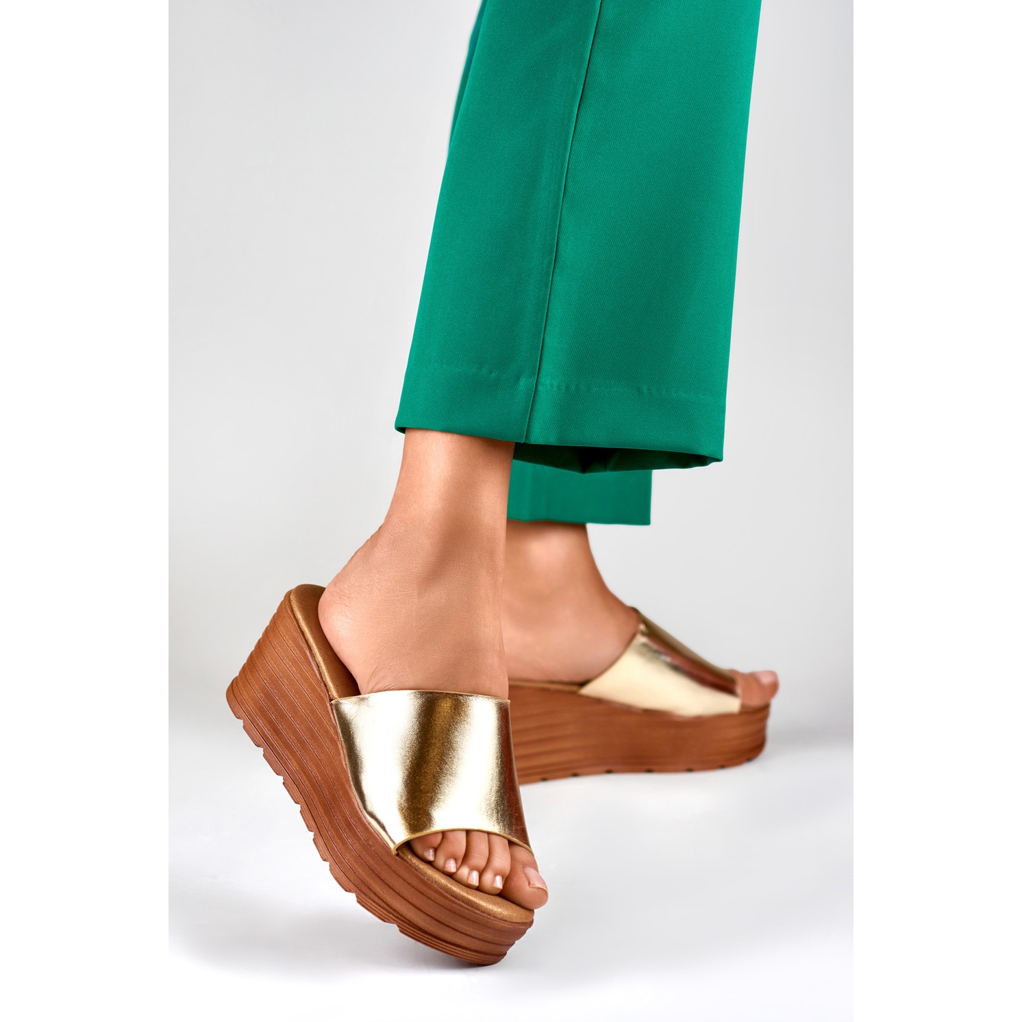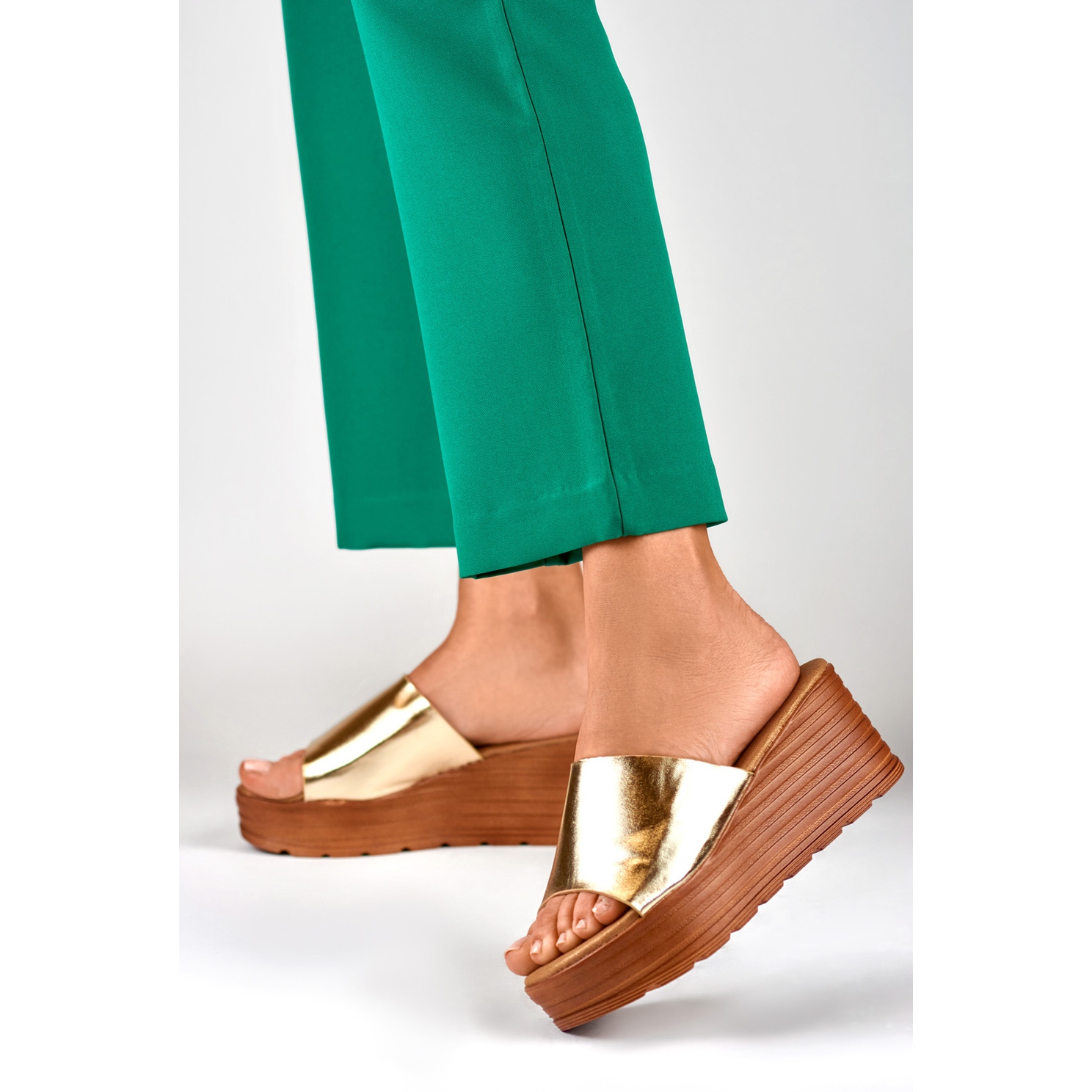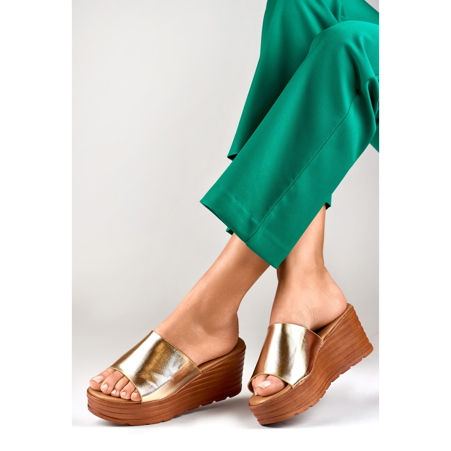 Les sandales compensées dorées Versis sont des chaussures élégantes pour femmes, parfaites pour les sorties quotidiennes. Ce produit a été créé par la marque Versis, connue pour créer de la mode dans un style unique et original. Les mules compensées sont de couleur dorée, ce qui leur confère un caractère élégant et unique.