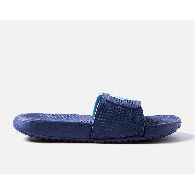 Les pantoufles sont faites de caoutchouc à la fois à l'extérieur et dans la semelle, ce qui peut suggérer qu'elles sont résistantes à l'eau et faciles à nettoyer. La couleur de la semelle est bleu marine et la teinte de la chaussure est bleu marine.