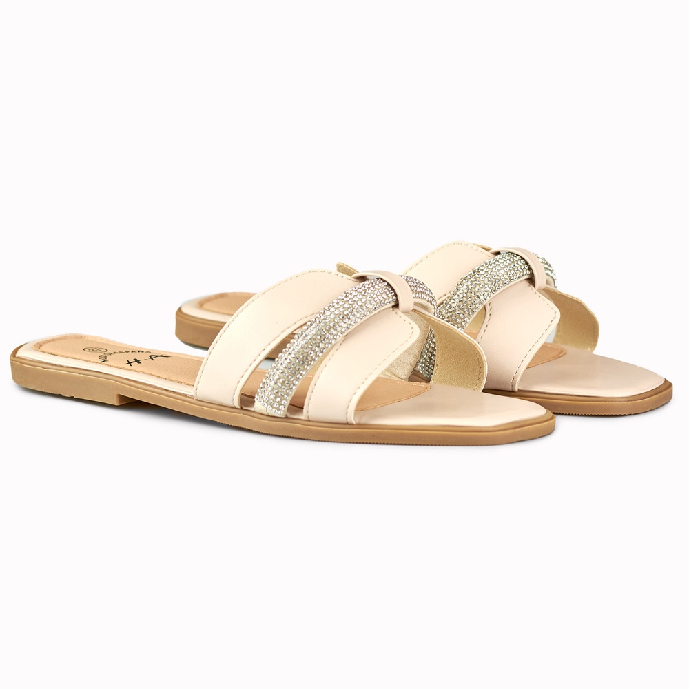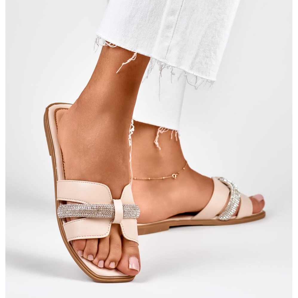 Les tongs sont entièrement fabriquées en cuir écologique - tant la tige que la semelle intérieure. Il y a des paillettes sur la partie supérieure de la chaussure, qui ajoutent brillance et élégance. De plus, ils sont décorés de zircons, ce qui les rend particulièrement attrayants.