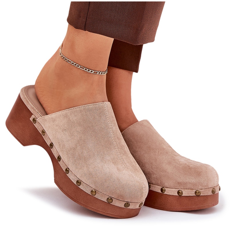 Nous présentons des tongs féminins élégants et élégants avec des goujons, ce qui attirera certainement l'attention de chaque amateur de mode. Ces sabots beige et en daim sont une proposition idéale pour les jours d'été, combinant le confort et les tendances.