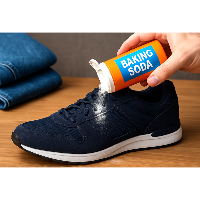 1. Saupoudrez généreusement de bicarbonate de soude à l’intérieur de vos chaussures