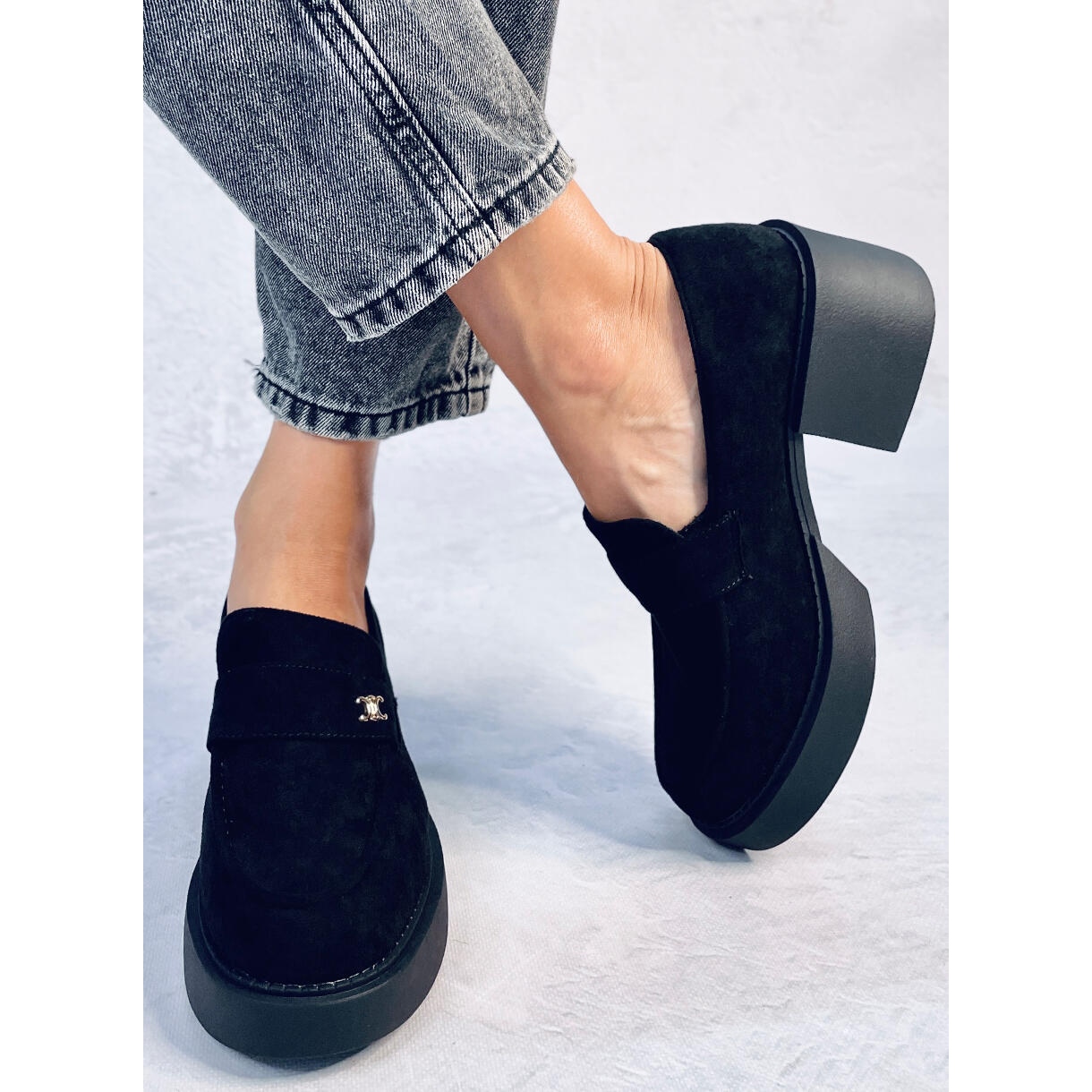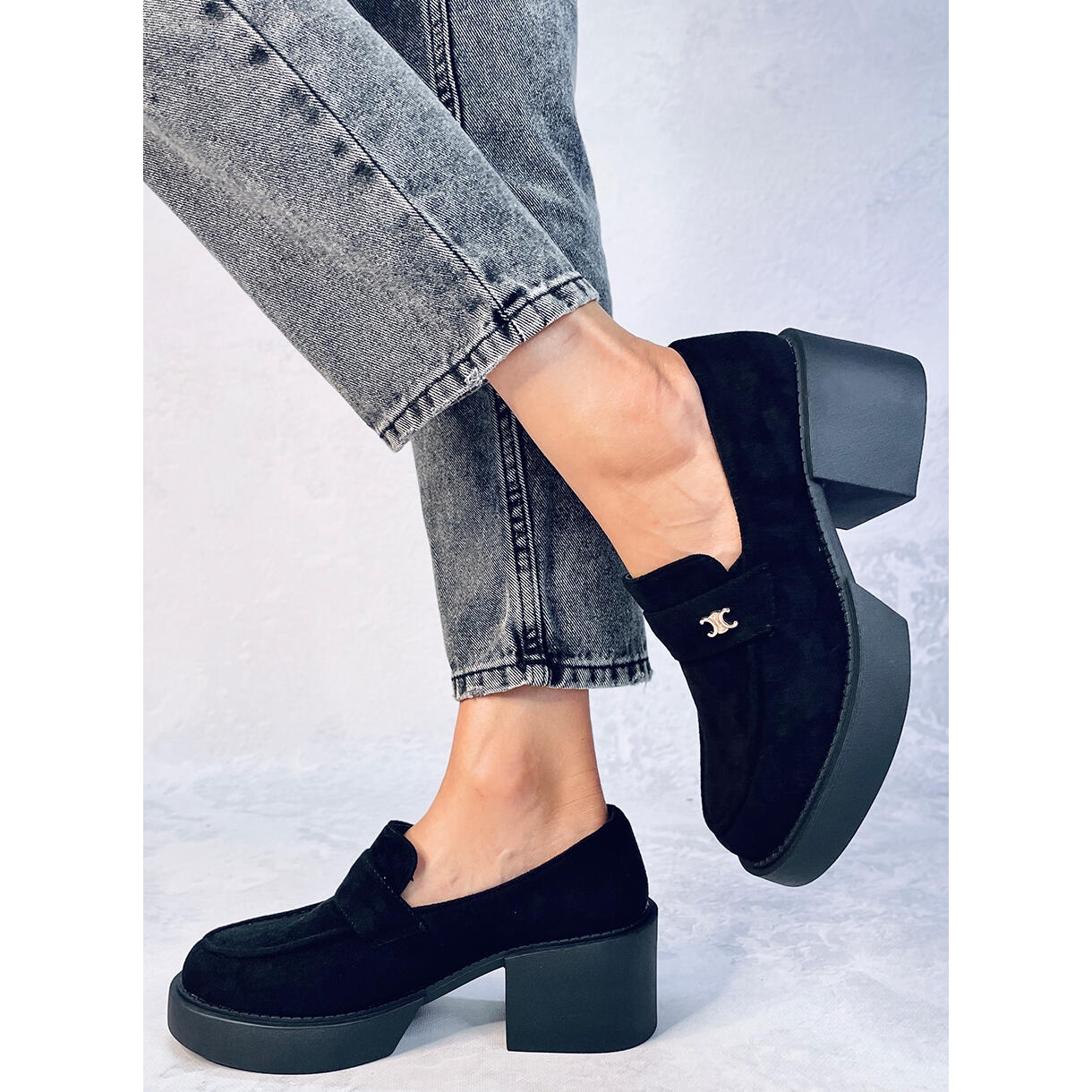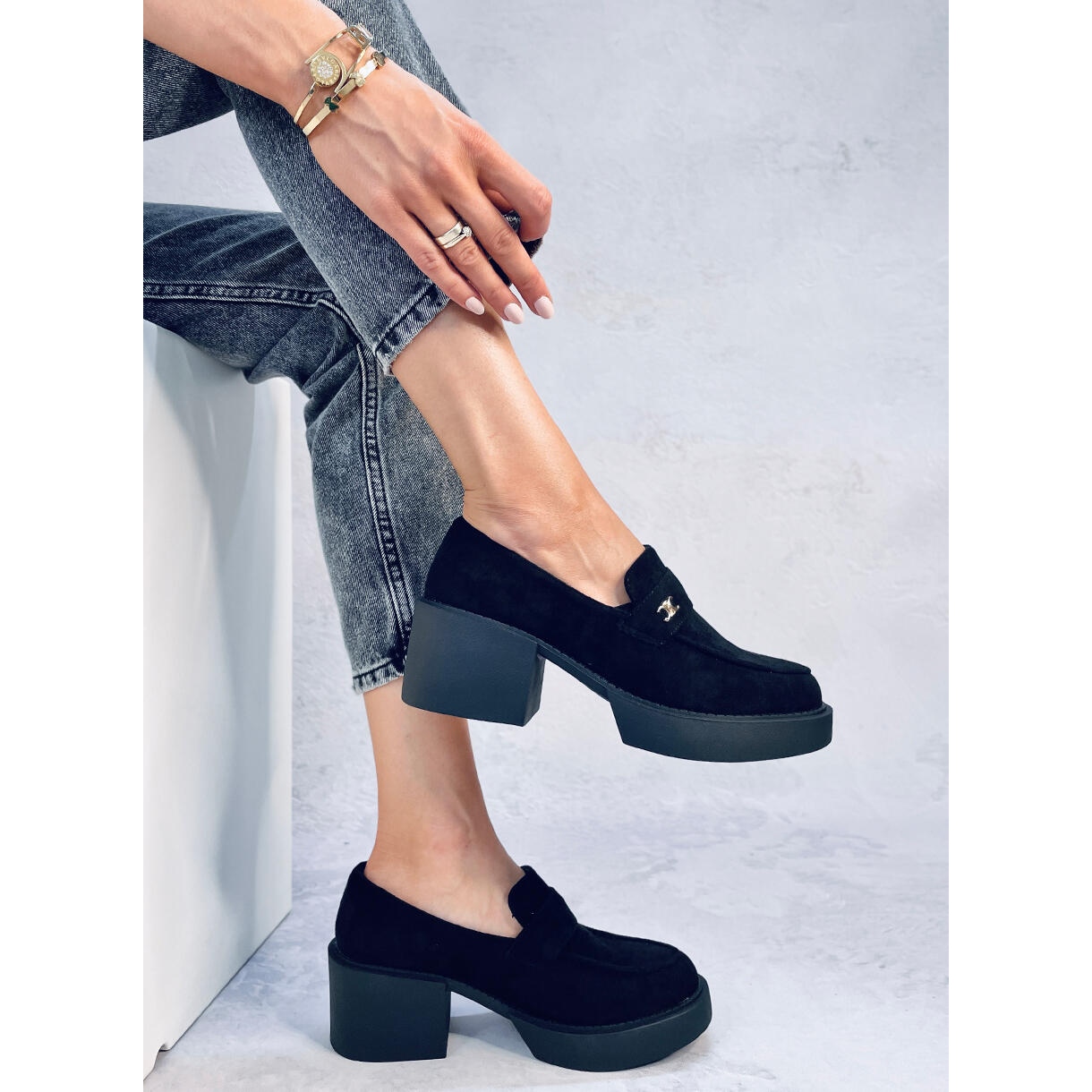 Les mocassins à talons hauts Coniff Black sont des chaussures en daim pour femmes au design classique. Le daim noir s'intégrera parfaitement dans n'importe quel style. Les chaussures se caractérisent par un talon large de 6 cm de haut, qui est en outre soutenu par une plateforme de 2 cm de haut. Grâce à cette solution, les mocassins assurent commodité et confort de port toute la journée. Les chaussures ont également des bouts ronds, typiques des mocassins.