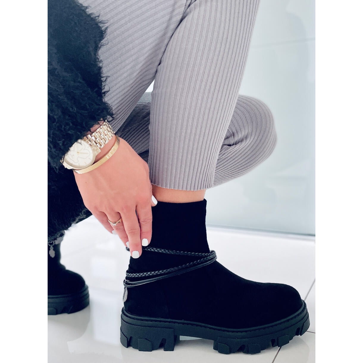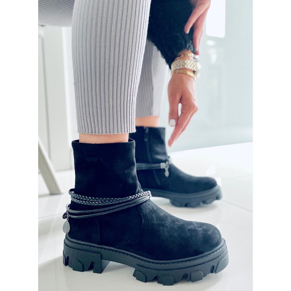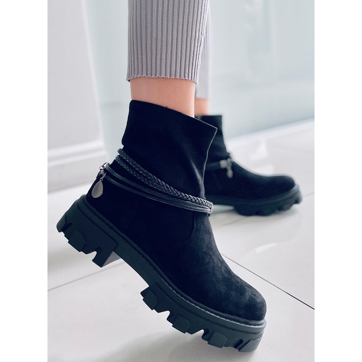 La tige des bottes est décorée d'une sangle amovible avec des sangles, ce qui permet un ajustement facile aux préférences individuelles. Grâce à la fermeture éclair pratique, l'enfilage est simple et rapide. Le daim écologique avec lequel ils sont fabriqués leur confère un caractère luxueux, et la délicate fourrure à l'intérieur apporte confort et chaleur, ce qui en fait un choix parfait pour les journées les plus froides.