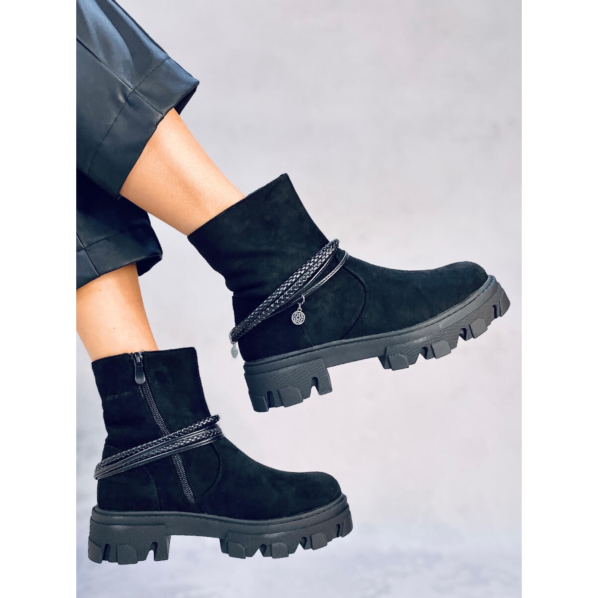 Les bottines plates Connie Black sont des bottines noires élégantes pour femmes. Ils sont fabriqués en cuir suédé écologique, ce qui garantit un superbe look tout en respectant l'environnement. Elles se caractérisent par une semelle haute, qui leur ajoute originalité et style. La tige des bottes est ornée d'une bride amovible composée de lanières, qui souligne encore davantage leur design unique.