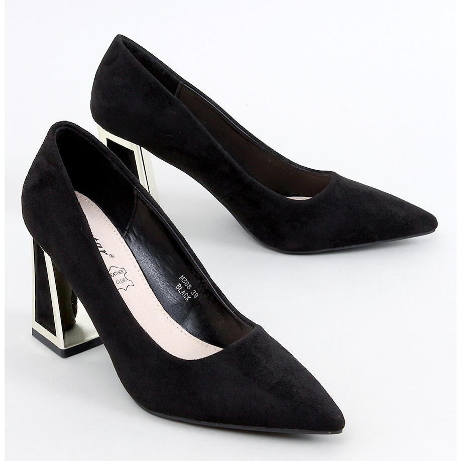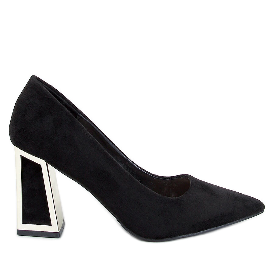 Découvrez l'élégance et la commodité des pompes noires constiales. Ces chaussures de femmes en daim avec un talon géométrique de 9 cm de haut sont la combinaison parfaite de style et de confort. La coupe galbée en combinaison avec des inserts d'or attire l'œil et ajoute un caractère unique à toute stylisation.