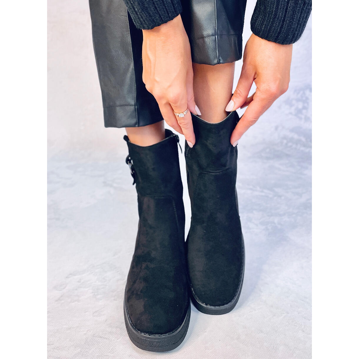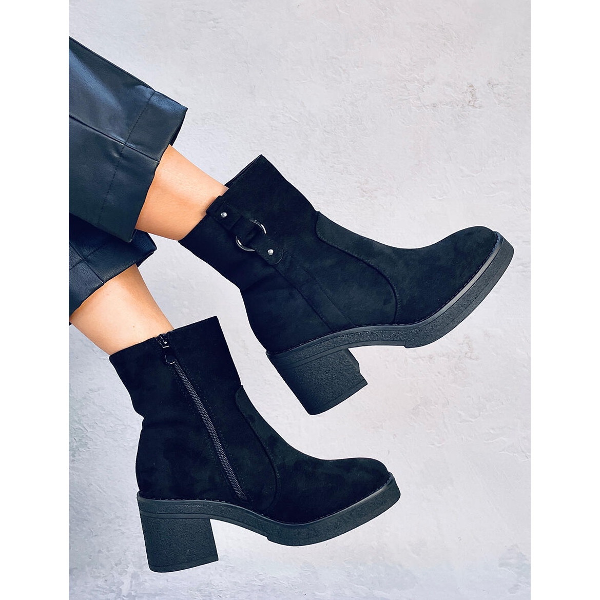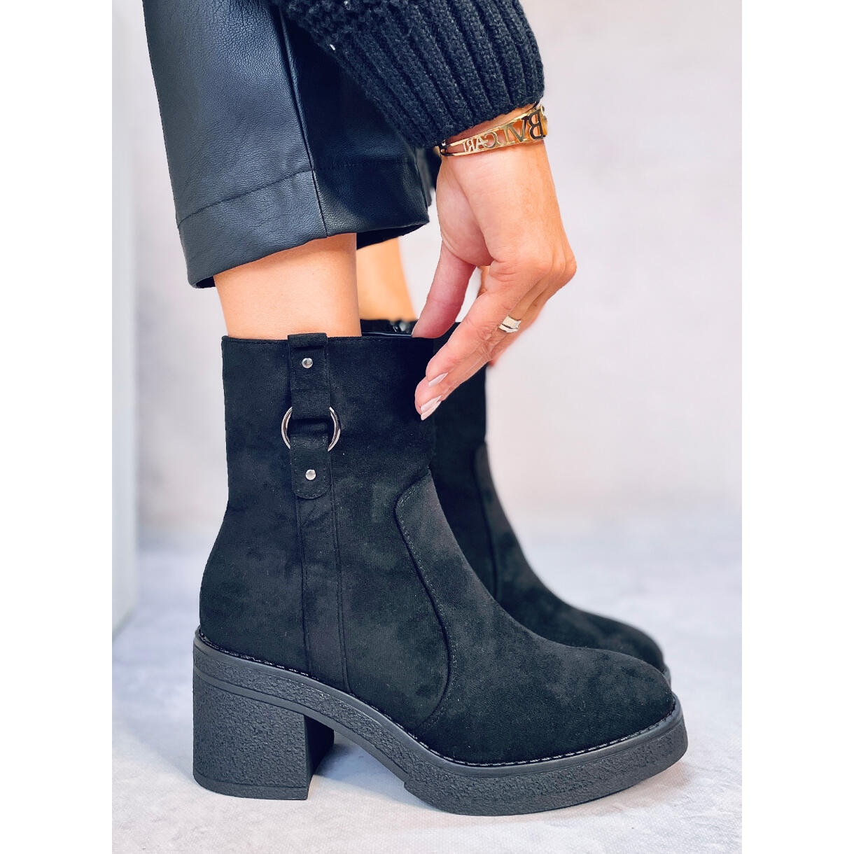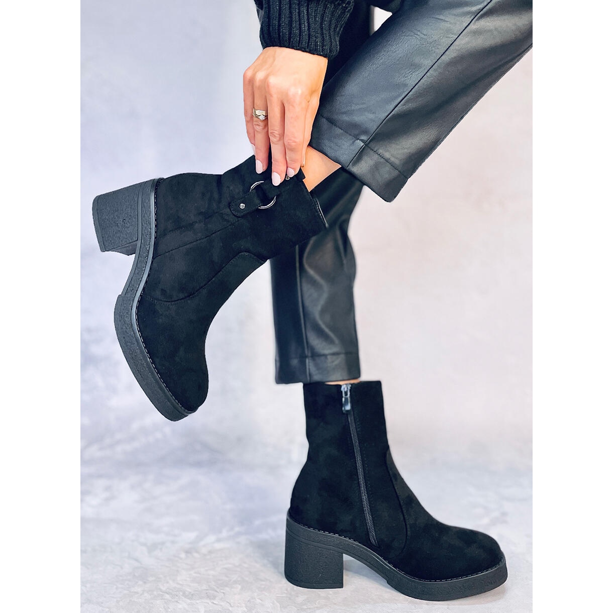 Les bottines sont des chaussures pour femmes élégantes et à la mode. Il se caractérise par un talon haut large et stable de 7 cm qui, outre le confort de port, confère au pied un aspect élégant. Les bottes sont noires, faites de cuir écologique avec une finition en daim, ce qui les rend à la fois durables et élégantes. L'intérieur des bottes est doublé d'une fourrure délicate qui garde vos pieds au chaud pendant les journées les plus froides.