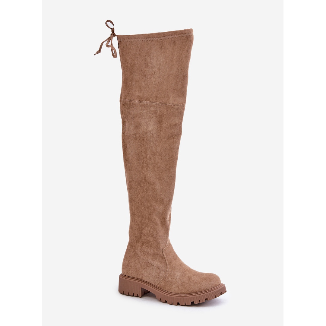Nous vous présentons d'élégantes cuissardes à talon plat en éco-daim de couleur beige tendance. Ces chaussures élégantes pour femmes sont le choix parfait pour la saison automne-hiver, alliant confort et style.