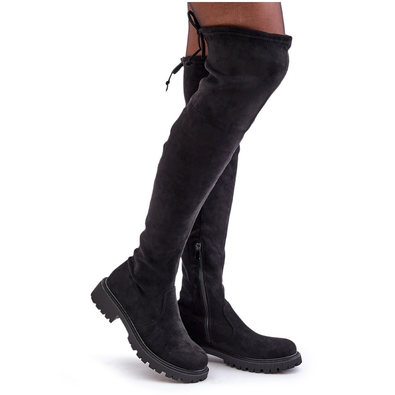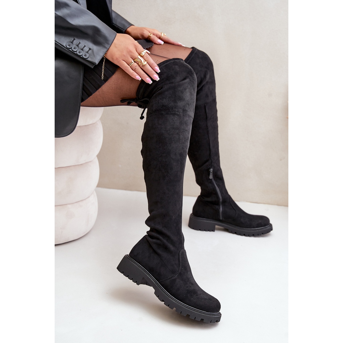 Les cuissardes à talons plats en éco-daim, noires, sont un choix parfait pour les femmes qui apprécient à la fois le style et le confort. Fabriquées en cuir suédé écologique de haute qualité, ces bottes élégantes seront le complément parfait à tout style d'automne et d'hiver.