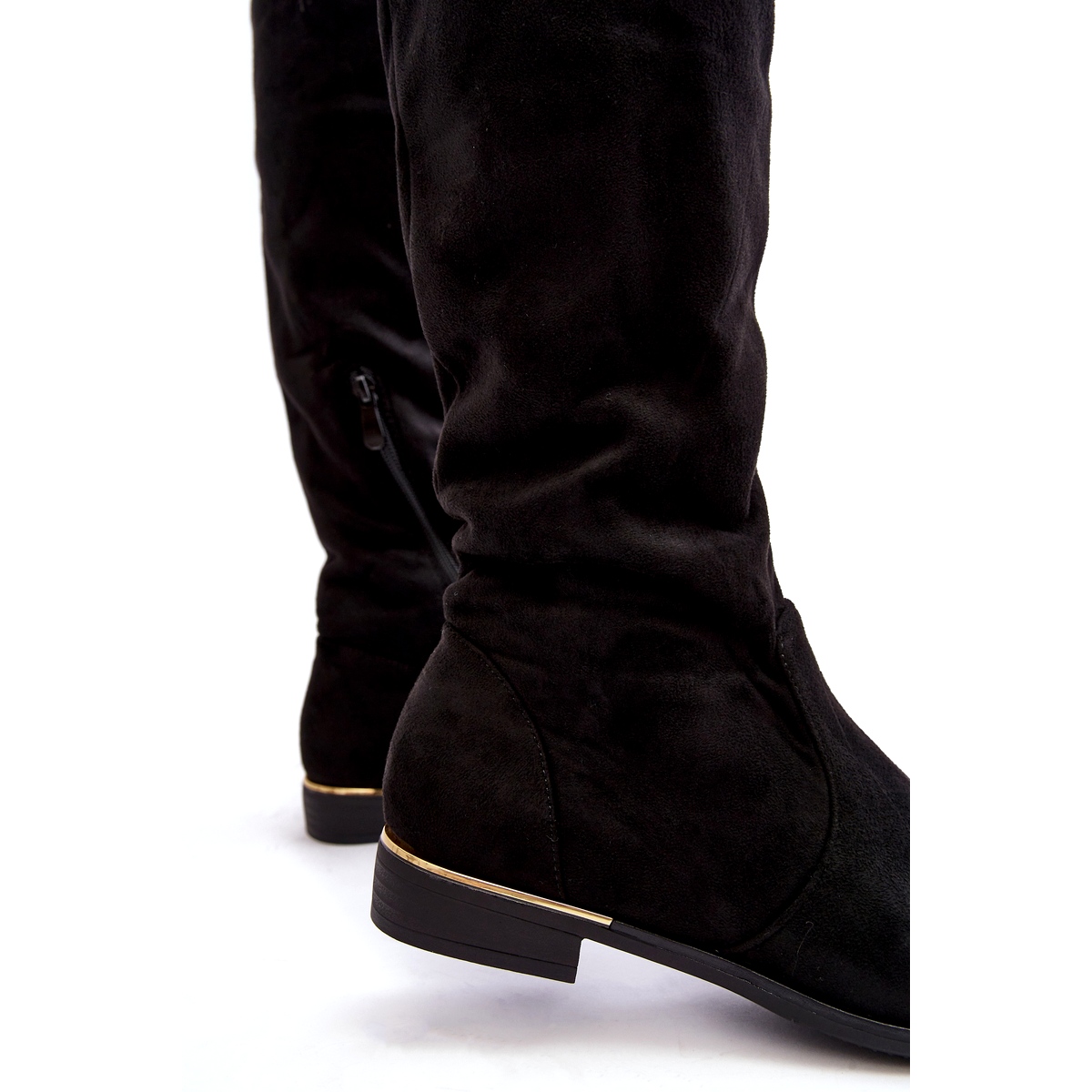 Des bottes de genou élégantes et pratiques en daim eco de haute qualité. Le modèle inséré avec une fixation de fermeture éclair supplémentaire assure une insertion rapide et un certain ajustement. Le talon plat de 2,5 cm donne de la stabilité et du confort tout au long de la journée, et le talon raidi améliore le confort de la marche.