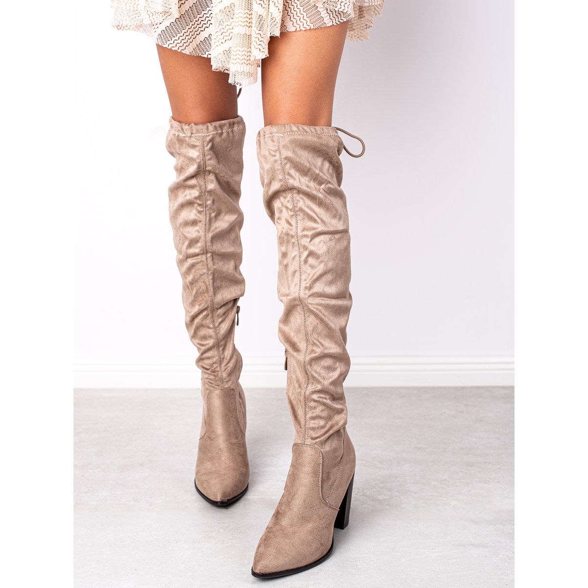 Découvrez l'élégance et la classe avec les bottes à talons hauts VINCEZA dans une belle nuance de beige. Ces bottes élégantes, conçues pour les femmes, allient un confort exceptionnel et une excellente finition. Le talon est fermé et rigidifié, ce qui offre un maintien optimal du pied, et la tige arrive au-dessus du genou, ajoutant du chic à n'importe quel style.