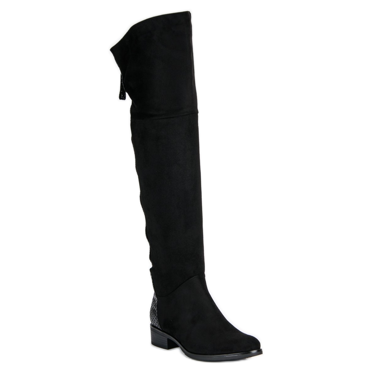Fabriquées en daim écologique, les bottes attirent l'attention non seulement par leur aspect raffiné, mais aussi par leur finition pratique - la peau de serpent leur donne un caractère unique. La tige haute, arrivant au-dessus du genou, galbe parfaitement la silhouette et le talon plat assure un confort même pendant toute la nuit.