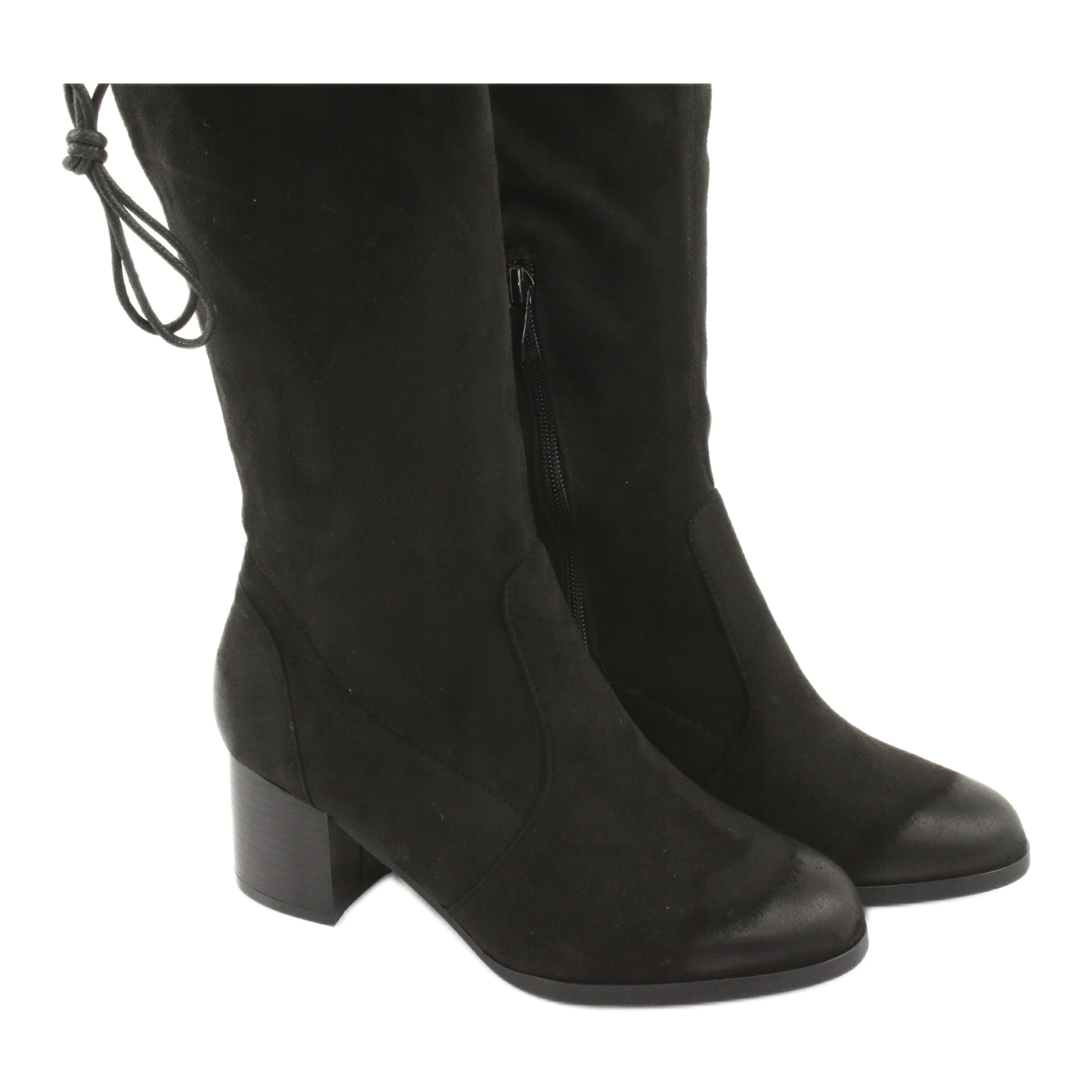 Nous vous présentons d'élégantes cuissardes en daim de M.Daszyński, modèle 1715, qui s'adaptent parfaitement aux dernières tendances de la mode. Fabriquées en matière textile en daim extensible, ces bottes s'adaptent parfaitement aux jambes, garantissant confort et style en toute occasion.