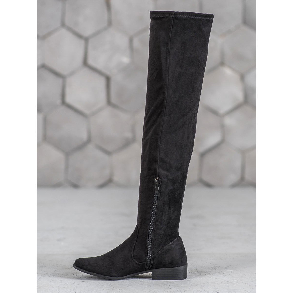 Voici les chaussures parfaites pour les femmes qui souhaitent allier style et confort : les mousquetaires en daim noir de SHELOVET. Ces bottes sensuelles, fabriquées en cuir suédé écologique de la plus haute qualité, sont un choix parfait pour les journées les plus froides. La tige longue, arrivant au-dessus du genou, protège non seulement efficacement les pieds du vent et de la pluie, mais allonge également optiquement les jambes, soulignant leur forme galbée.