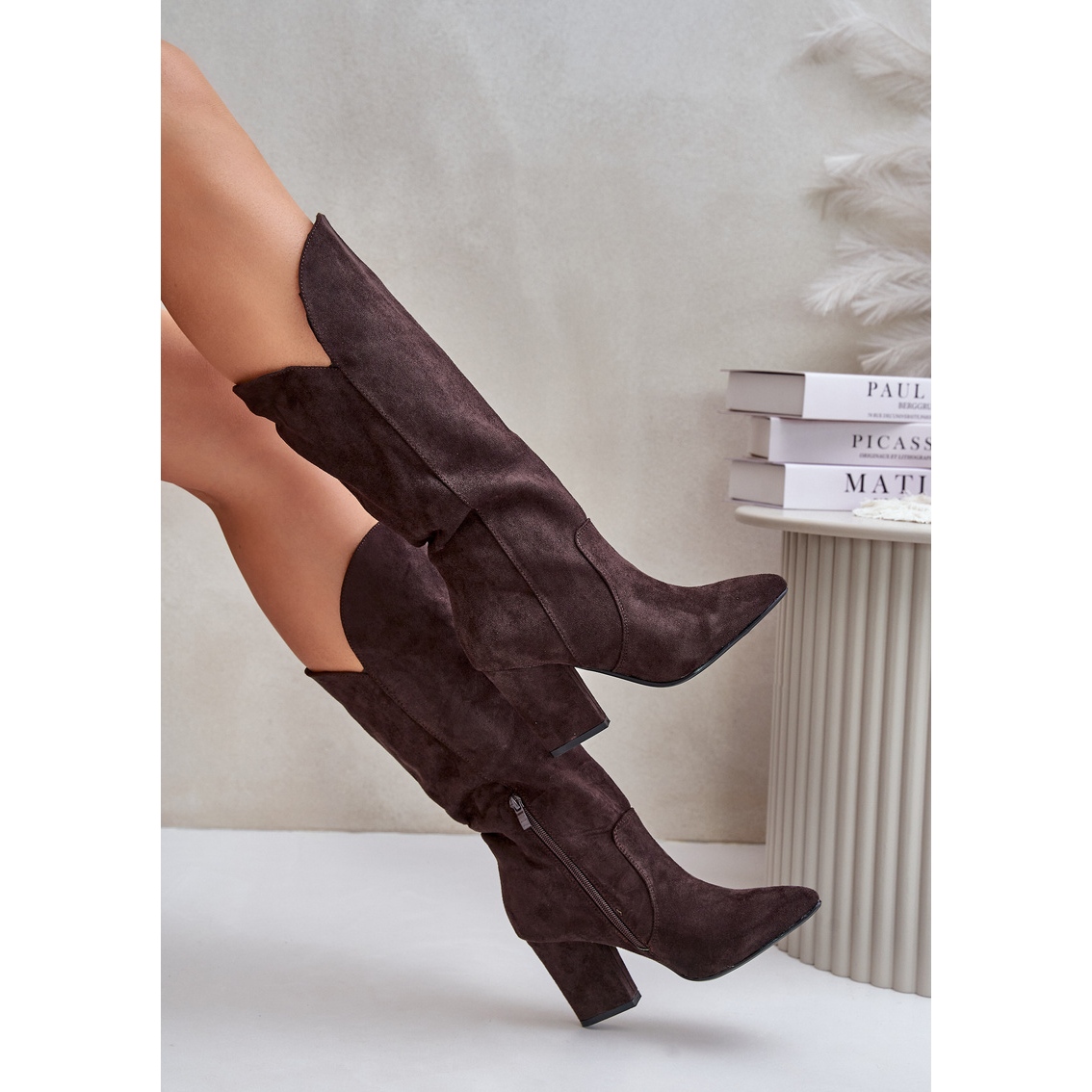 Leur structure insérée avec une fixation de fermeture éclair supplémentaire permet un pliage facile et rapide, et offre également un ajustement parfait à la jambe. Fabriqué en cuir en daim écologique de haute qualité, les bottes peuvent être utilisées quotidiennement et pour des occasions plus formelles, ce qui en fait un élément extrêmement universel des vêtements.