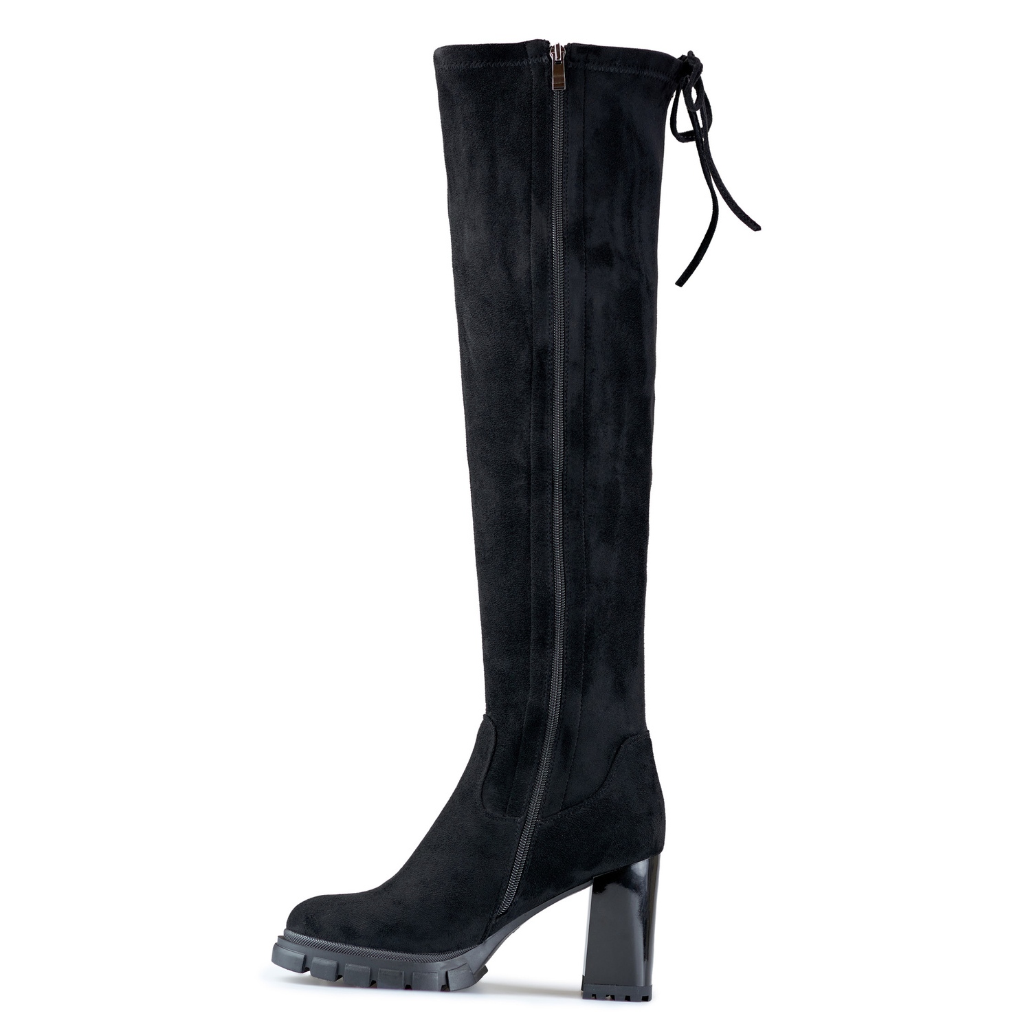 Ces mousquetaires pour femmes sont confectionnés en éco-cuir façon suède. Elles ont une élégante couleur noire qui se présente sur toute la surface de la chaussure, y compris la semelle noire. Le talon haut de 9 cm est réalisé dans un style bloc, ce qui ajoute de l'élégance et affine la silhouette. Les chaussures arrivent au-dessus du genou et la hauteur supérieure est de 50 cm.