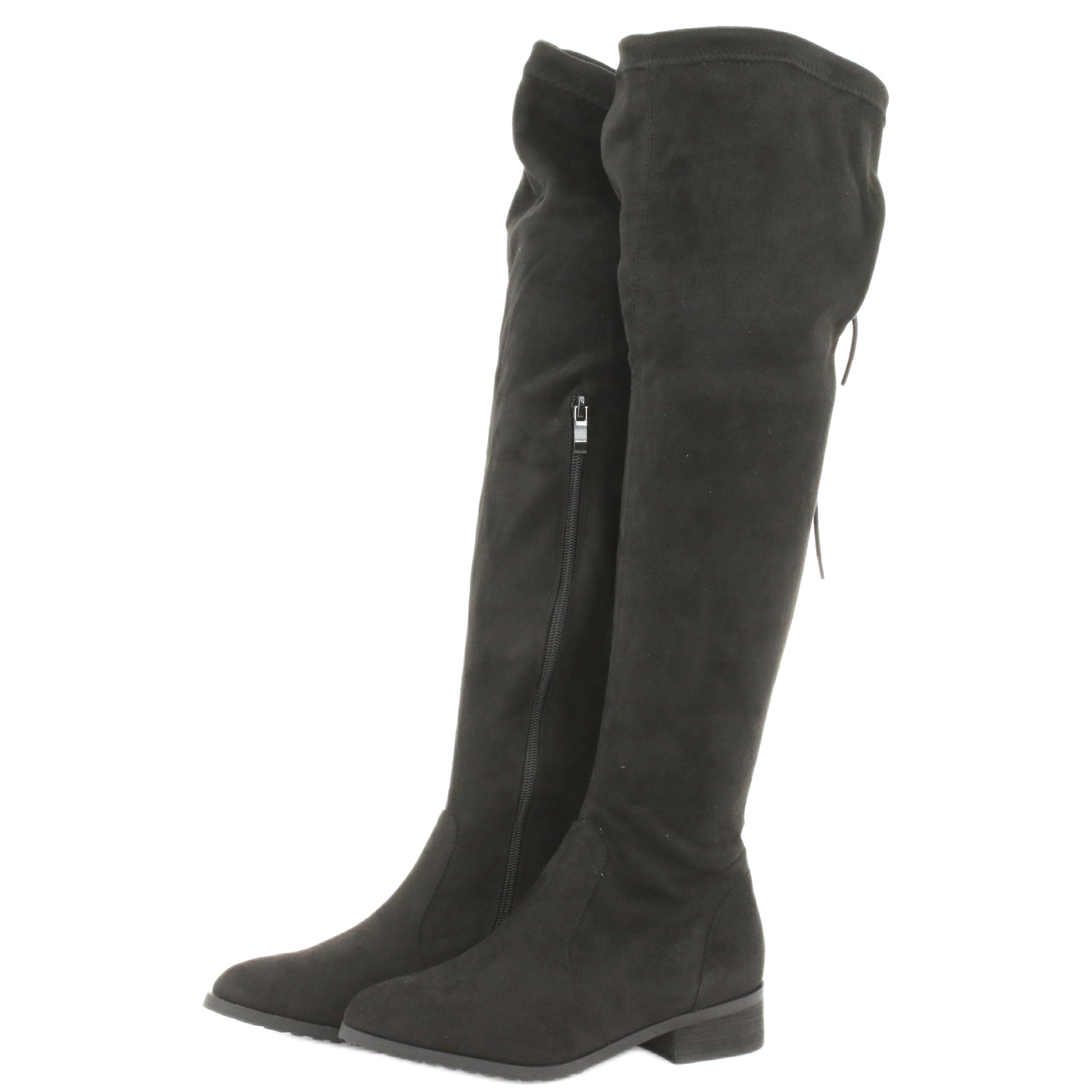 Nous vous invitons à découvrir les cuissardes uniques M.Daszyński, modèle 1602, qui allient élégance et confort. Ces longues bottes noires sont réalisées dans une matière textile sous forme de daim extensible, qui s'adapte parfaitement à la forme de la jambe, soulignant ses lignes et ajoutant de l'élégance.