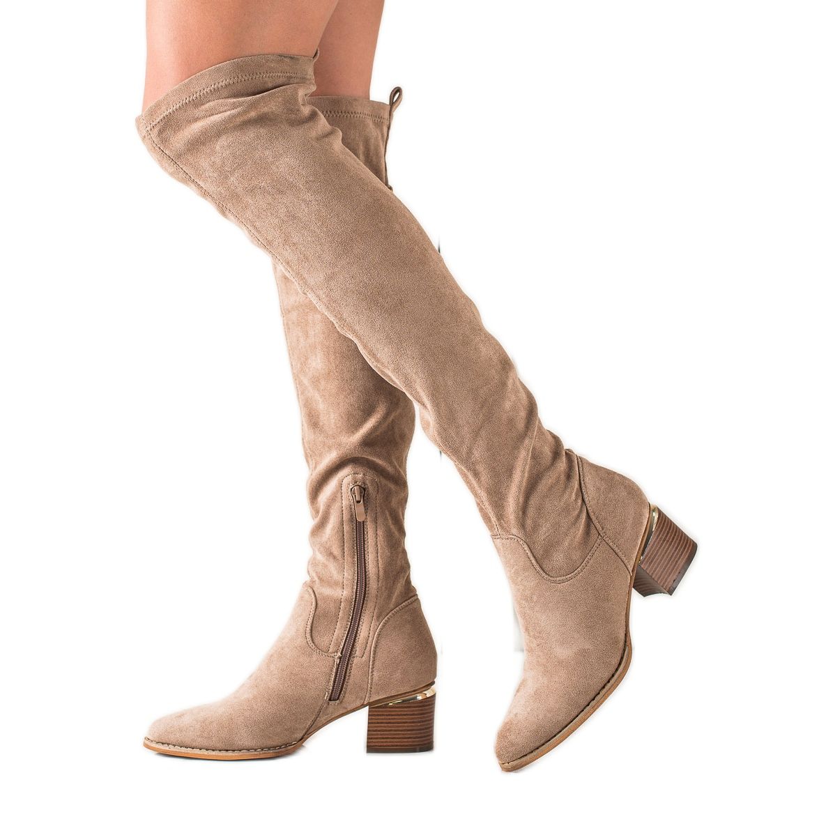 Les bottes se caractérisent par une tige haute au-dessus du genou, qui non seulement souligne la silhouette, mais assure également une isolation optimale les jours les plus froids. Le contrefort du talon est fermé et rigidifié, ce qui garantit stabilité et confort au porté. L'utilisation de suède synthétique de haute qualité et de matières synthétiques dans la semelle ajoute classe et élégance aux chaussures.