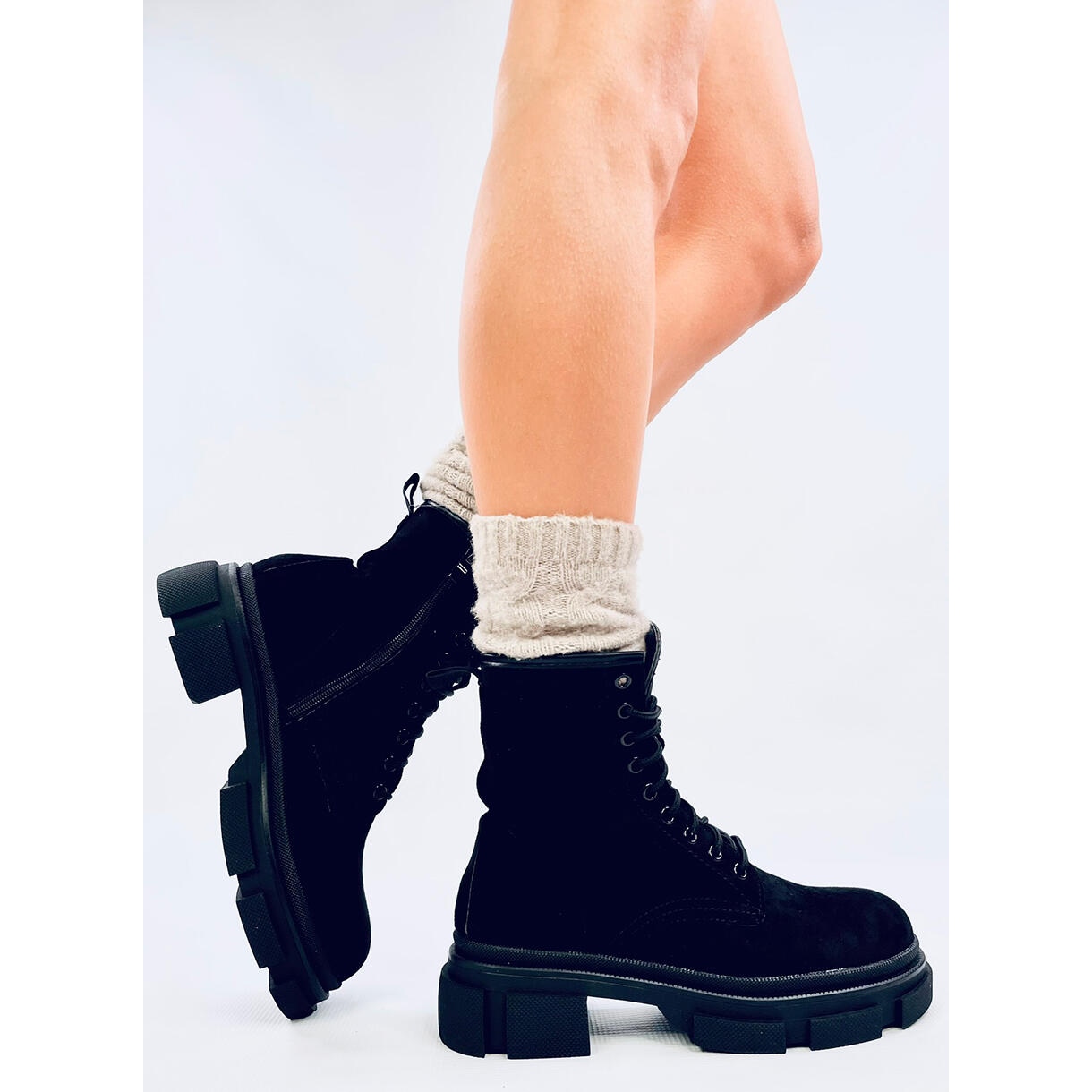 Découvrez des ouvriers en daim uniques qui allient style et fonctionnalité. Ces élégantes bottines noires pour femmes à semelle épaisse sont le choix parfait pour les froides journées d'automne. Grâce à la fermeture éclair pratique sur le côté de la tige, enfiler les chaussures est un véritable plaisir. Un laçage traditionnel supplémentaire permet un ajustement parfait à la largeur du pied, ce qui garantit confort et commodité de port.