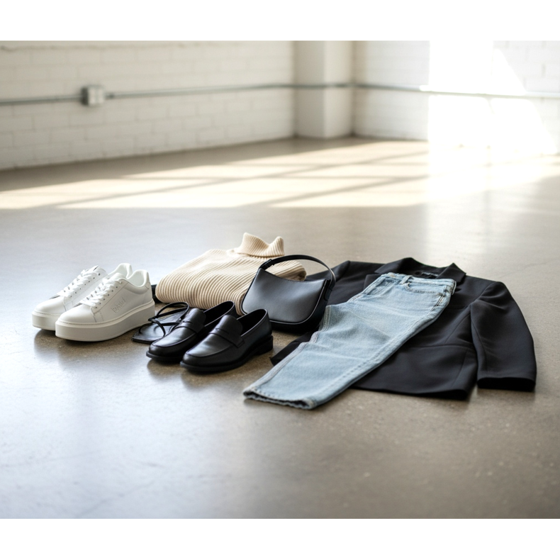 Approche minimaliste : Des baskets blanches ou crème des années 90 avec un jean droit ou un jean mom et un t-shirt ajusté. Pas de décorations, des lignes épurées, une palette de couleurs neutres. C'est un look qui reflète pleinement l'esprit de la décennie du minimalisme.