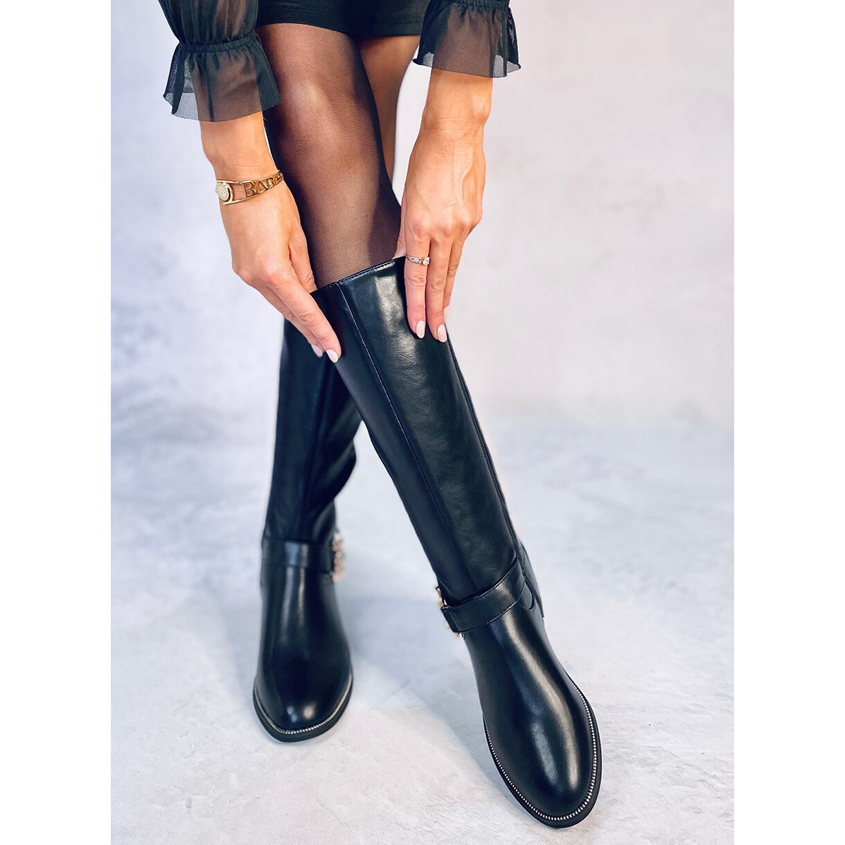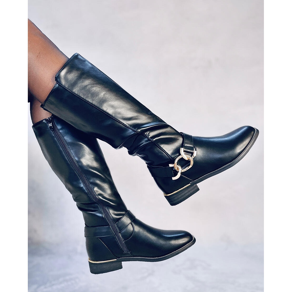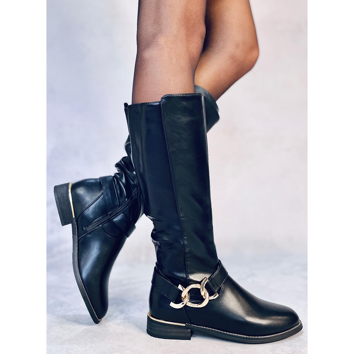 Les bottes de genou pour femmes classiques pour Devers Black sont une combinaison d'une coupe intemporelle avec une chaîne dorée à la mode qui attire l'œil et ajoute du caractère. Fabriqué en cuir écologique avec une texture lisse, sur une doublure en mousse - confortable et agréable à utiliser, idéal pour les stylisations de tous les jours.