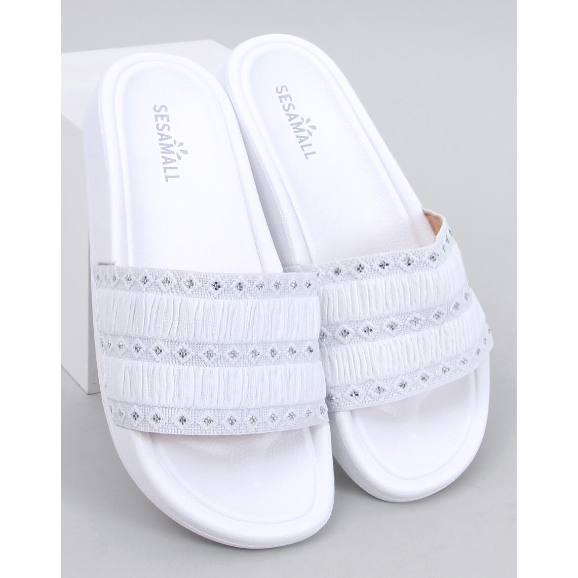 Les tongs blancs Diakis sont caractérisés par un talon plat de 2 cm de haut, ce qui les rend extrêmement confortables pour de longues promenades. Un motif lisse et une couleur blanche minimaliste les font se fondre parfaitement avec diverses stylisations. Un avantage supplémentaire est les strass qui donnent aux volets une lueur unique.