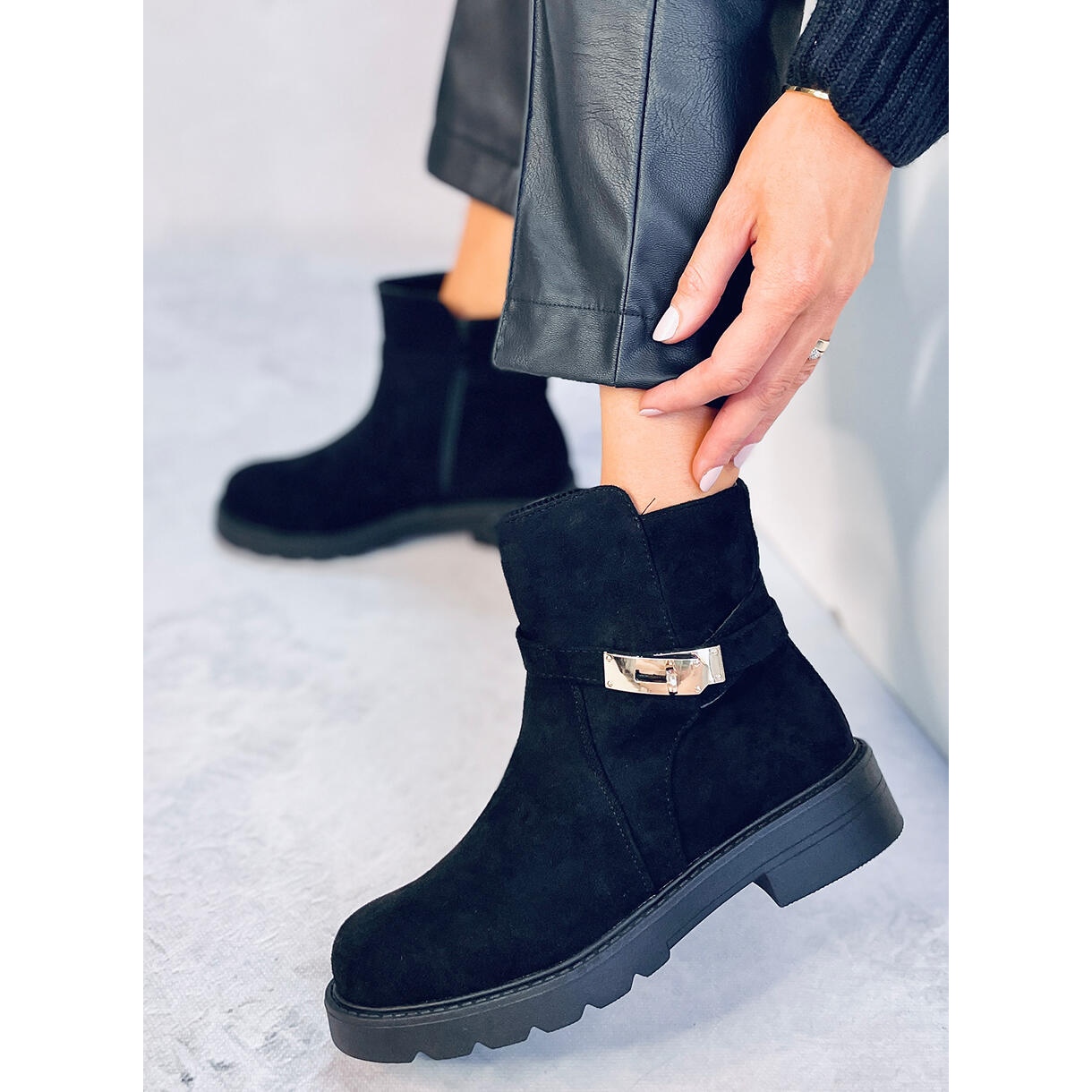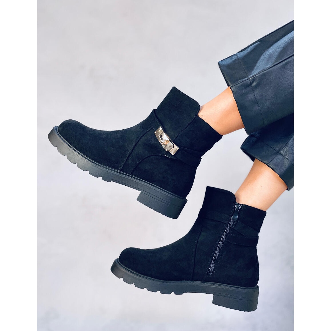 Le produit décrit est des bottines pour femmes en daim noir écologique. Ces bottes ont un talon plat de 3,5 cm de haut et arrivent au-dessus de la cheville.
