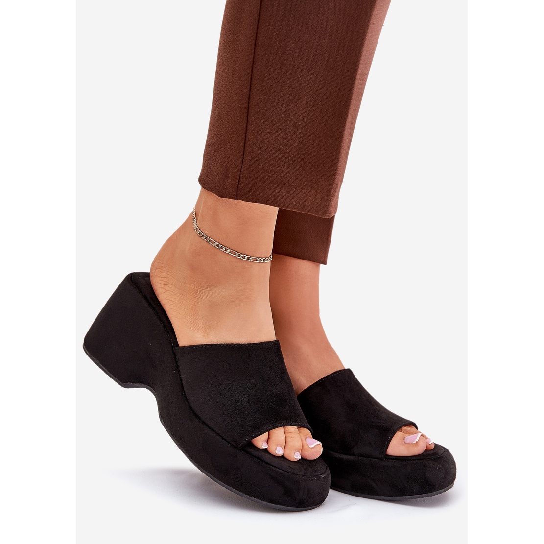 Détails: Éco daim des pantoufles féminines sur la plate-forme et des cales noires