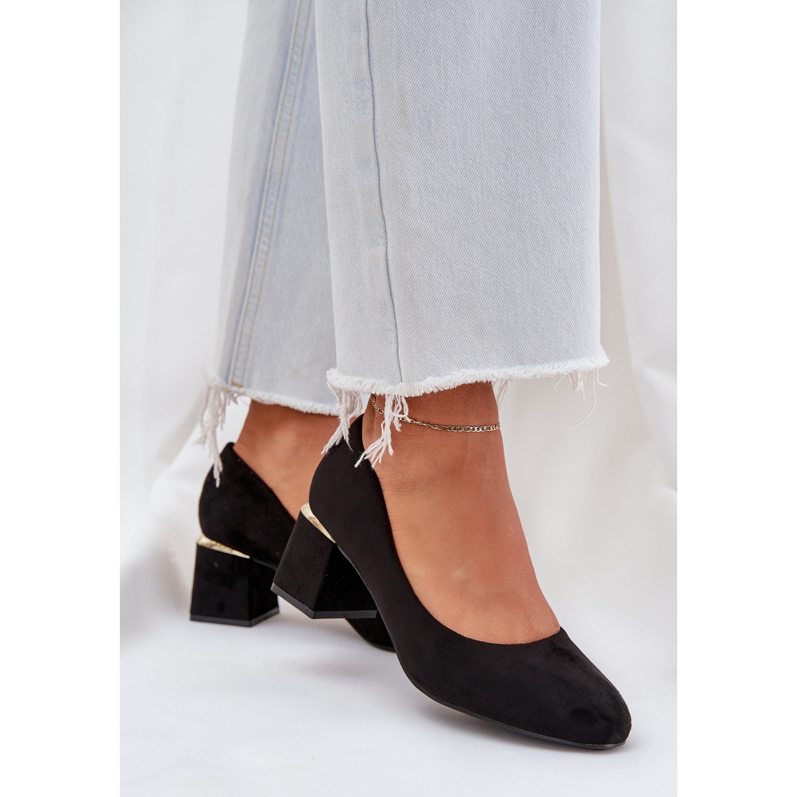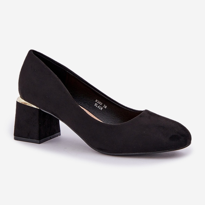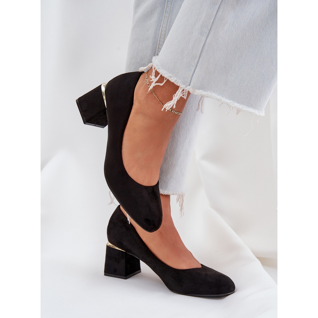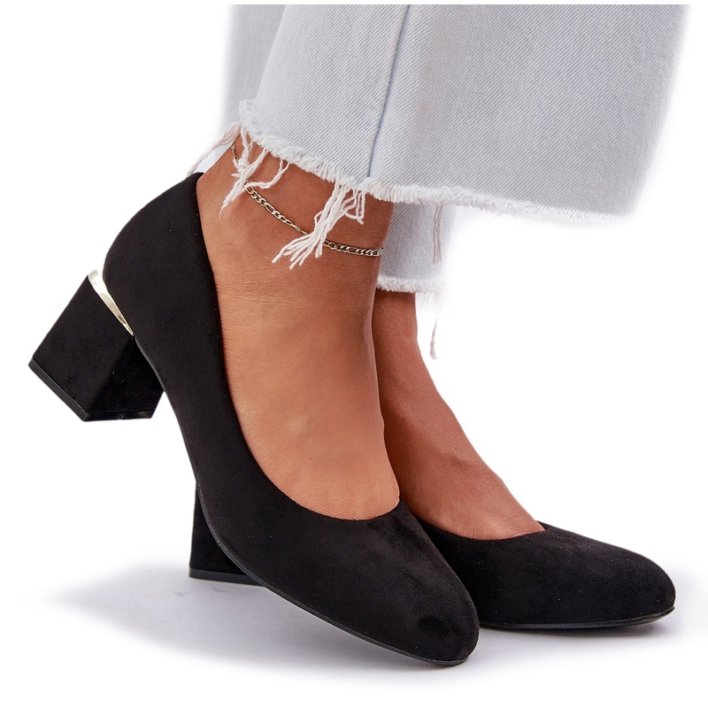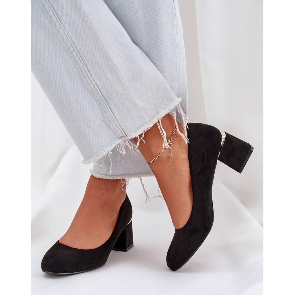 Découvrez l'élégance et le confort de porter grâce aux pompes en daim Eco sur un post noir. Ces pompes élégantes en daim eco de haute qualité sont un excellent choix pour chaque femme qui veut souligner son style unique. Les orteils arrondis caractéristiques garantissent le confort, et un talon de haut de haut, décoré d'un accent doré, ajoute une élégance subtile.