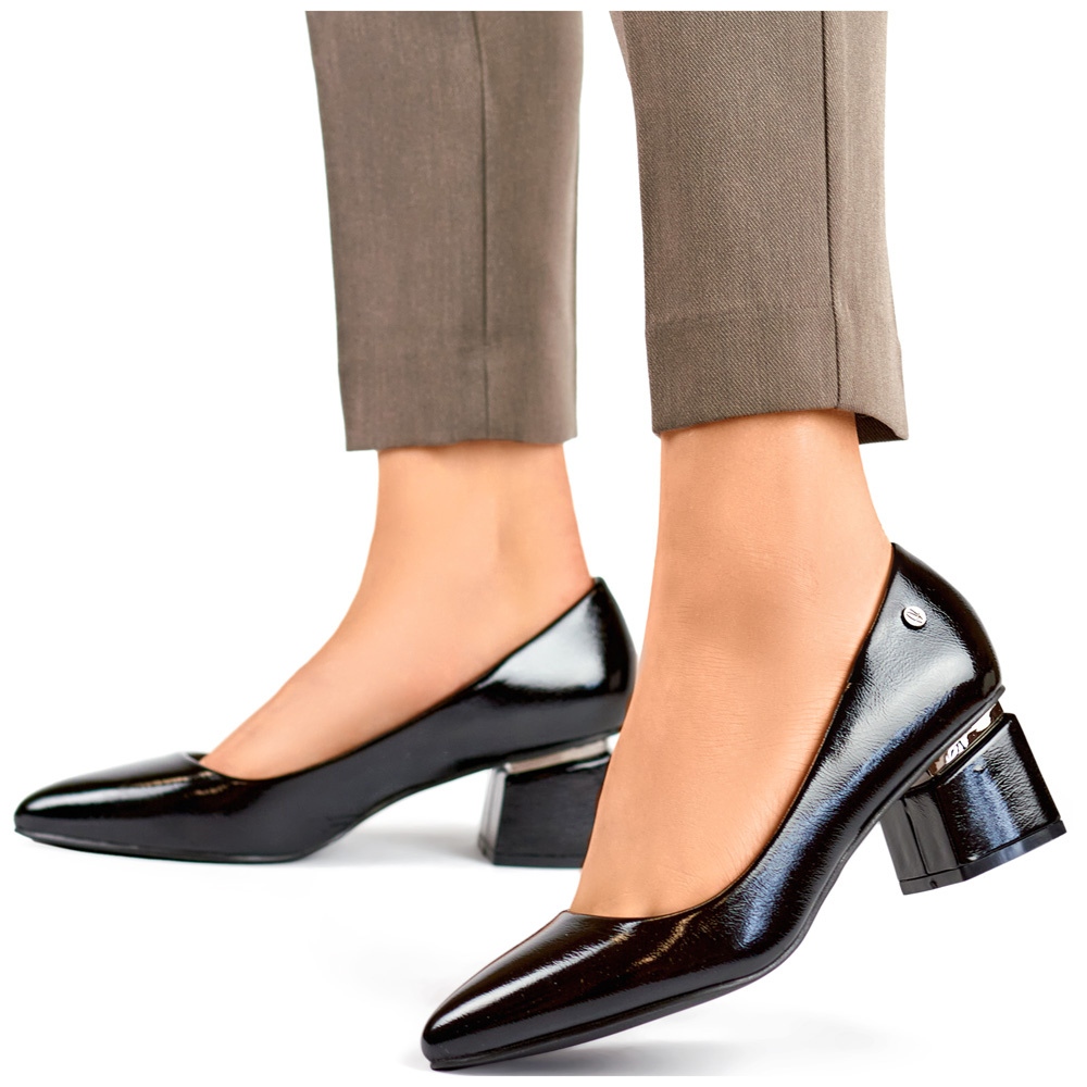Les pompes ont un orteil élancée en forme de Spitz, ce qui les fait allonger optiquement les jambes, et le talon moyen d'une hauteur de 5,5 cm assure le confort de porter toute la journée, sans abandonner le charme féminin. Grâce à la couleur noire classique, ces chaussures se mélangent parfaitement avec diverses stylisations - des robes élégantes aux ensembles quotidiens.