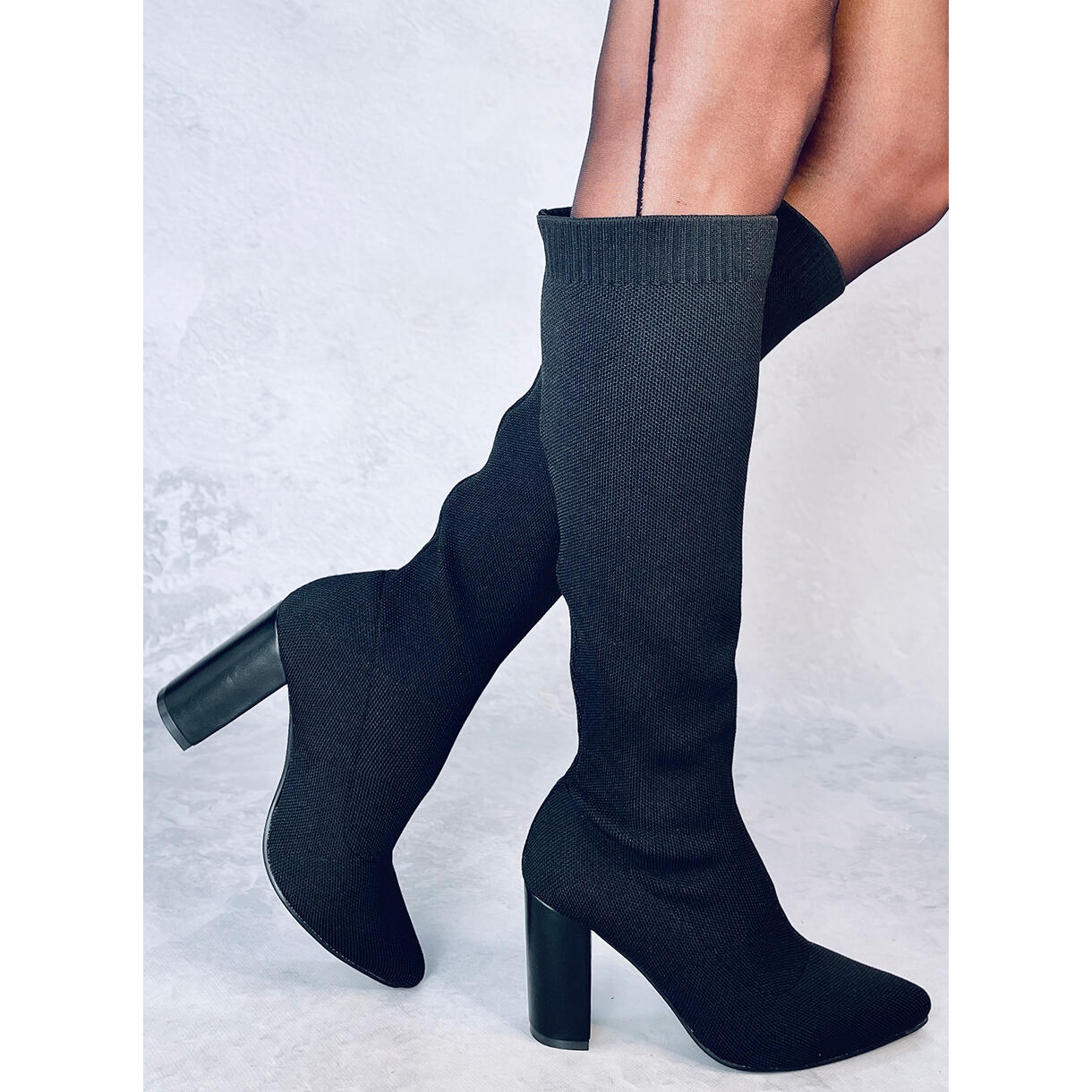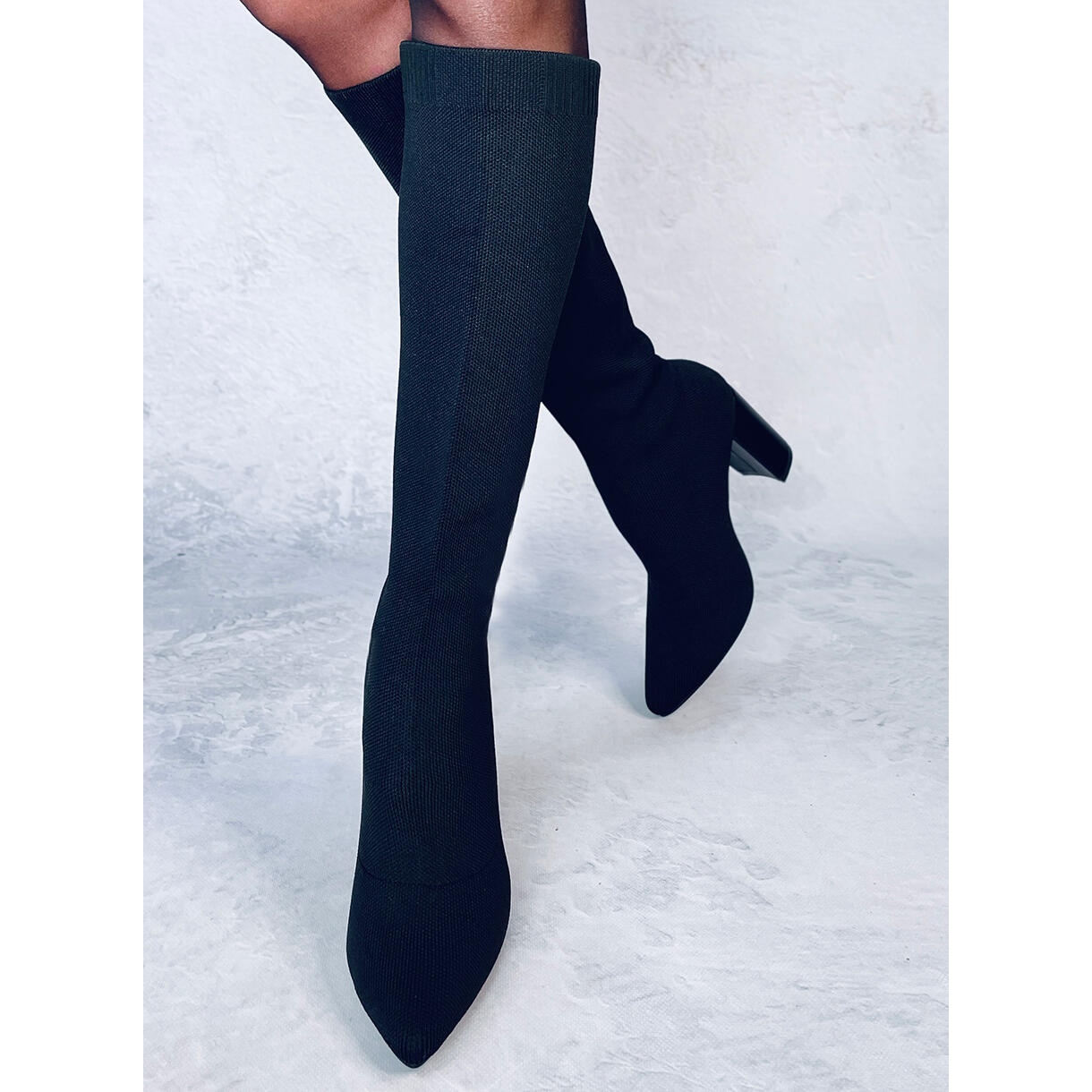 Les bottes à talons hauts élastiques Elisha Black sont des chaussures élégantes qui devraient figurer dans la garde-robe de chaque femme. Fabriquées dans un tissu chaussette de haute qualité, elles s'adaptent parfaitement aux jambes, soulignant leur finesse. Le design galbé avec des bouts en amande et une tige de 9,5 cm de hauteur affine efficacement la silhouette, donnant à chaque style un caractère sophistiqué.