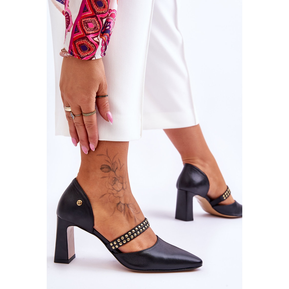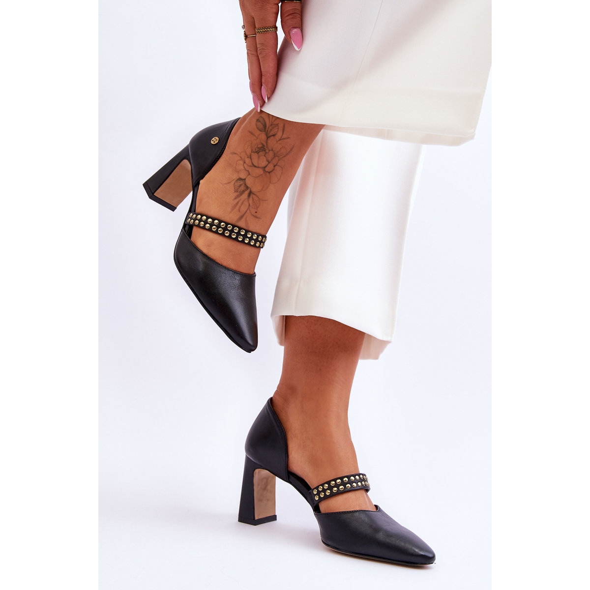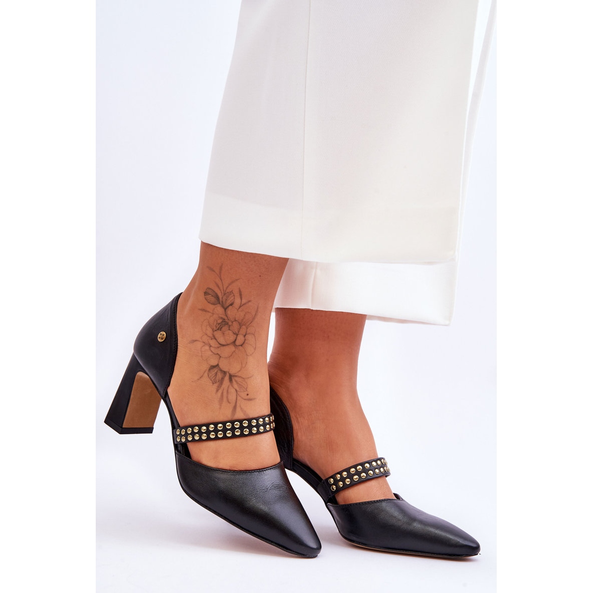 Pompes élégantes Maciejka en cuir naturel de haute qualité. La semelle intérieure en cuir souple offre un réconfort même lors d'un long port, et des performances précises et une attention aux détails mettent l'accent sur leur caractère intemporel. Une sangle décorative avec une bande élastique et des strass subtiles ajoute du style, et les accents dorés créent un effet discret et élégant. Un nez pointu et un type de talon stable (7,5 cm) ont optiquement mince la silhouette, ce qui rend les chaussures idéales pour les stylisations formelles et décontractées.