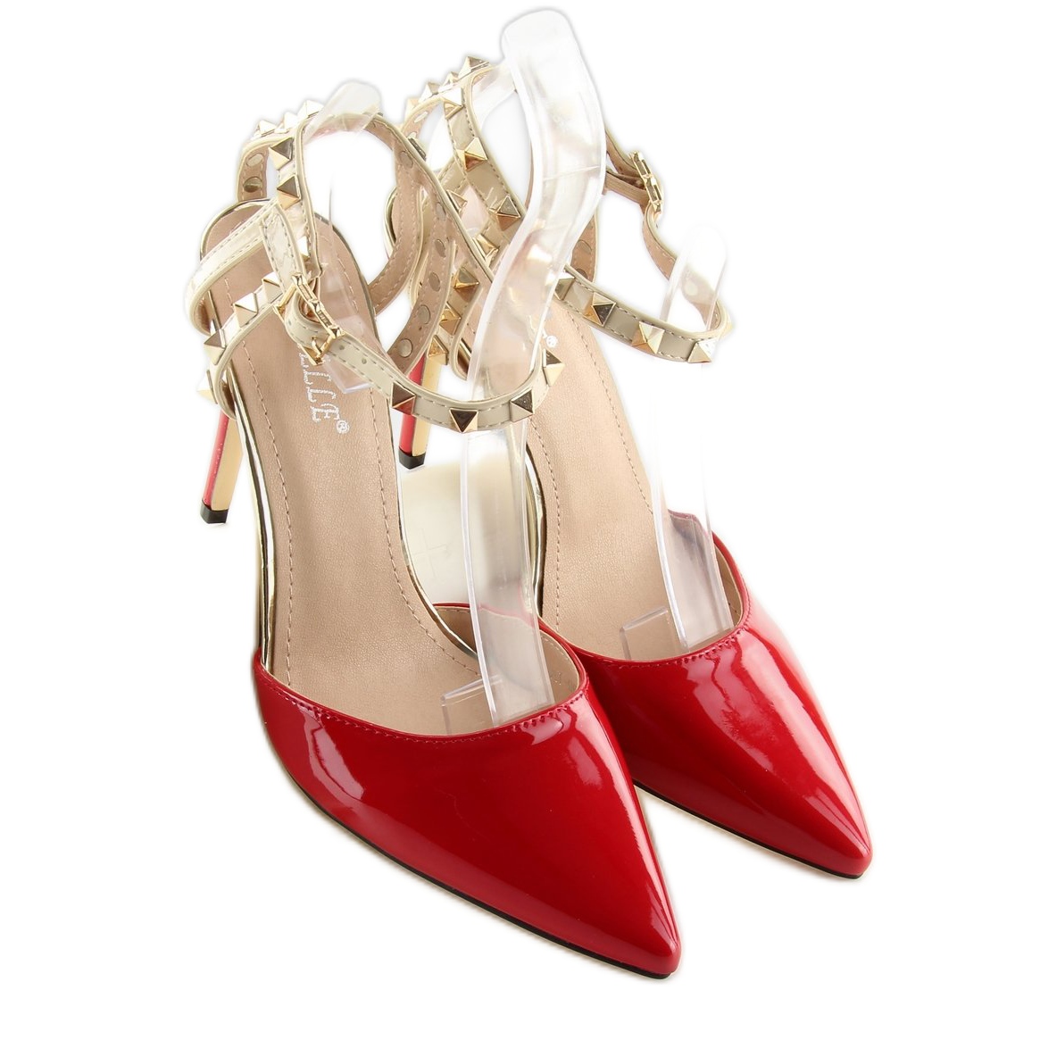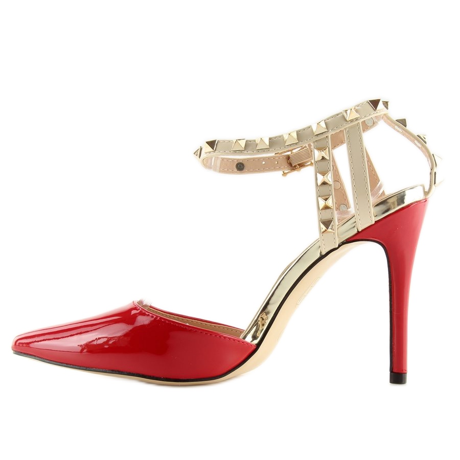 Fabriqués en éco-cuir de haute qualité et dotés d'une finition brillante, ces escarpins combinent de manière inhabituelle une couleur rouge intense avec des rayures beiges ornées de clous, qui leur confèrent une expression rock. Le modèle à bout pointu galbe parfaitement la silhouette et assure un look phénoménal sur la jambe.