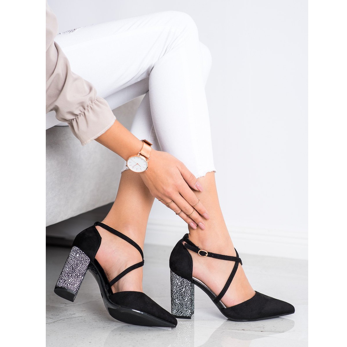 Les chaussures se caractérisent par un bout rond, qui leur ajoute subtilité et féminité. Le talon haut de 9 cm de haut assure non seulement un look élégant, mais aussi une stabilité grâce à sa forme en colonne. La fermeture à boucle facilite l'enfilage et le retrait des escarpins.