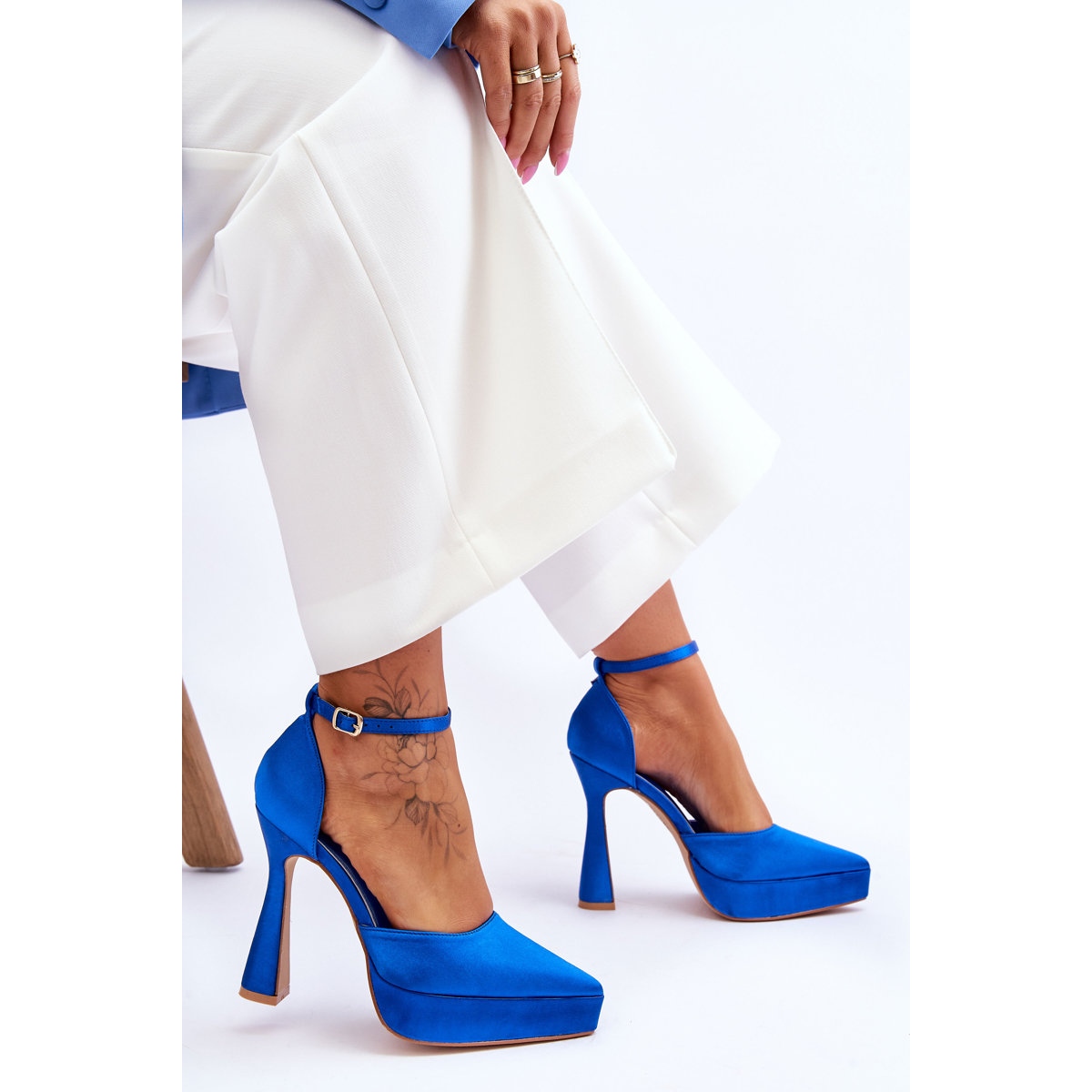 La tige des chaussures est faite d'un matériau textile de haute qualité imitant un satin luxueux, ce qui ajoute élégance et style. L'intérieur des escarpins est fini avec un insert en éco-cuir doux, qui garantit un confort tout au long de la journée. Un avantage supplémentaire est la fermeture autour de la cheville avec une sangle réglable avec boucle, qui permet un ajustement parfait à chaque jambe.