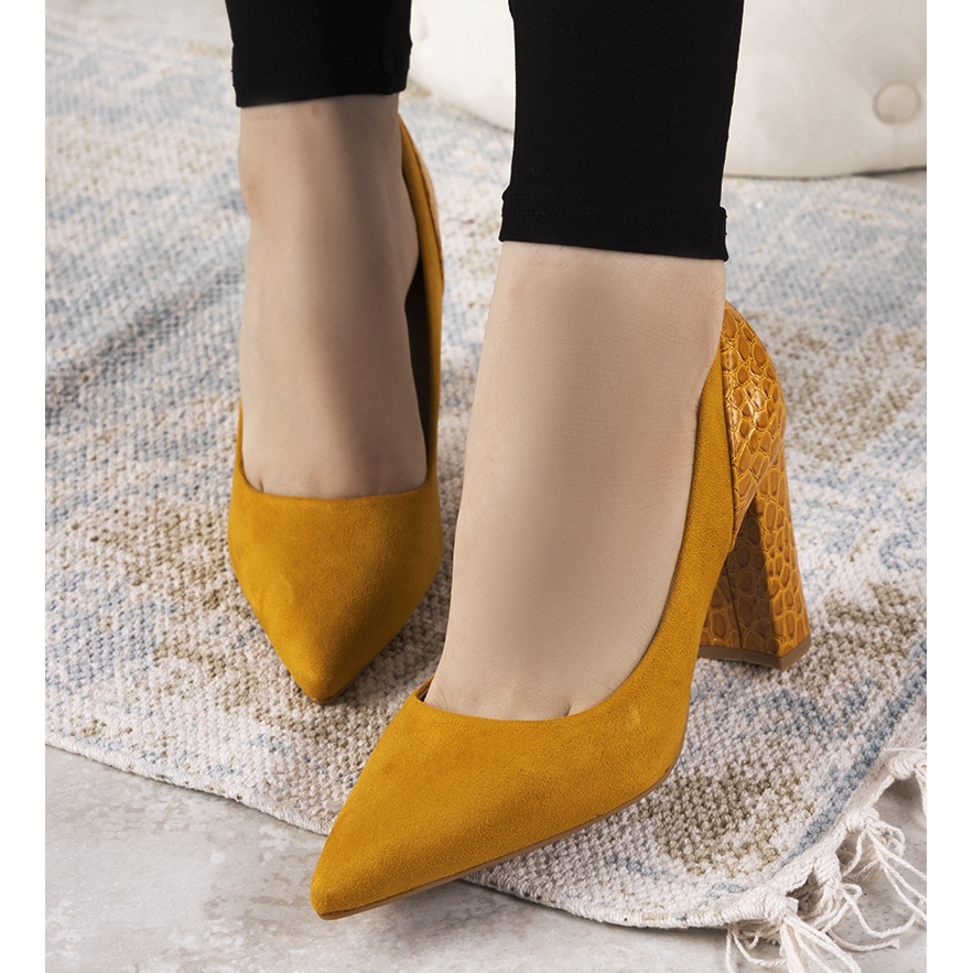 L'arrière des escarpins se distingue par un insert original en cuir écologique verni avec un motif intéressant, ce qui les rend non seulement confortables, mais aussi à la mode. La couleur jaune avec une semelle beige distincte attire le regard et anime même les tenues les plus sobres.